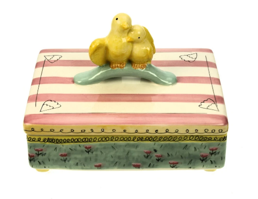 Lekker og romslig dekor boks med 2 gule fugler i keramikk fra vår fantastiske leverandør Meander i Nederland. Boksen måler hele 20x16 cm og kan brukes til å oppbevare smykker eller andre ting du vil ta vare på. Boksen gjør seg også uten å lagre noe i den - den er sjarmerende med striper på toppen og i vakre pastell farger.