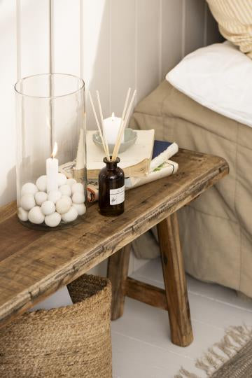 Unik benk Unika fra Ib Laursen på 90 cm lengde som er produsert i India av resirkulert treverk, noe som gir et unikt produkt i form og farge.