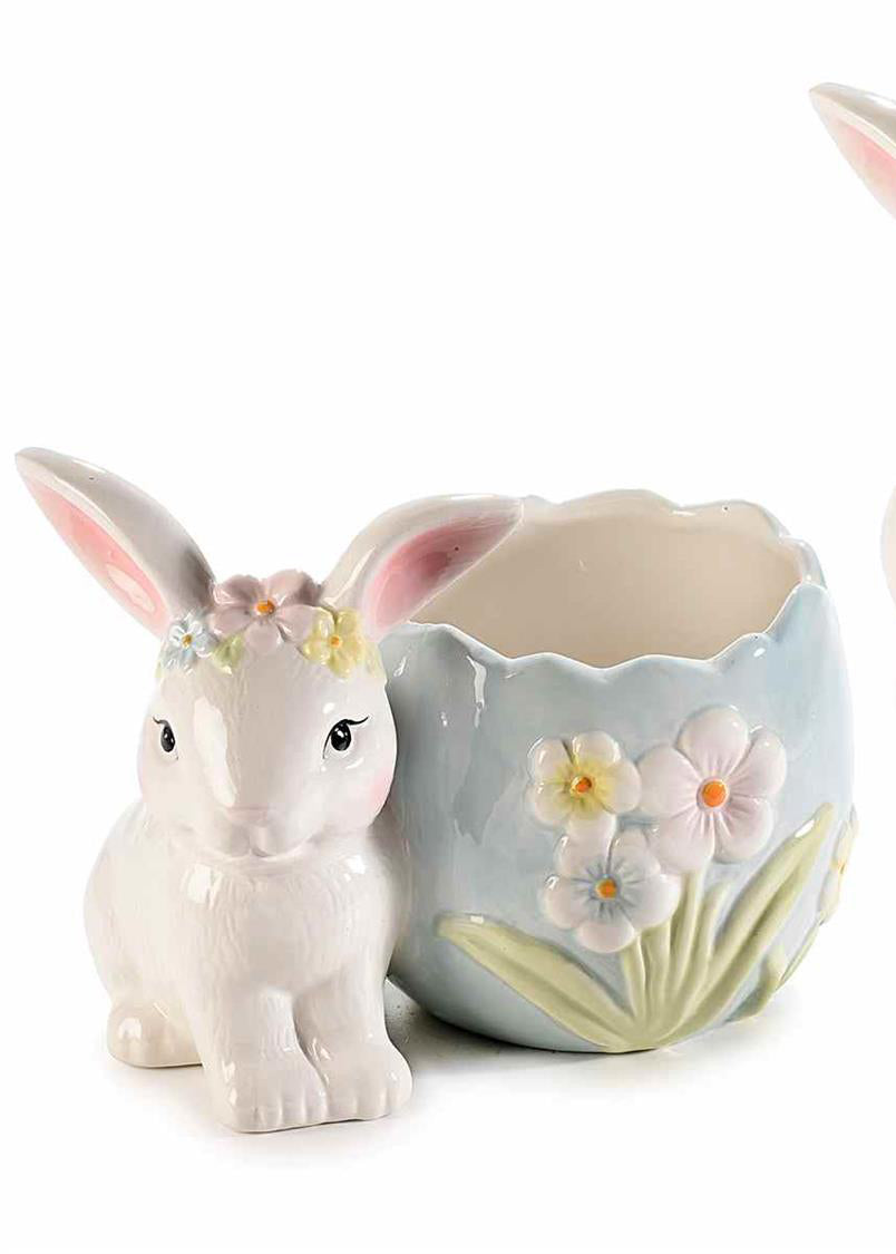 Herlig blå blomsterpotte formet som et egg fra Italia. Vasen er i keramikk og har utpreget dekor med blomster og harepus.