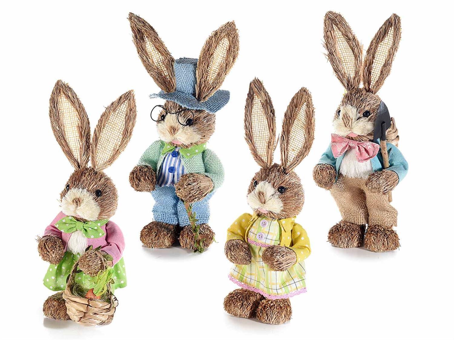 Denne sjarmerende påskekaninen kommer fra Art from Italy og er hele 33 cm høy med formbare ører. Den har herlige fargerike klær og hatt og er i fiber. Det er mannen bakerst til høyre med hatt.