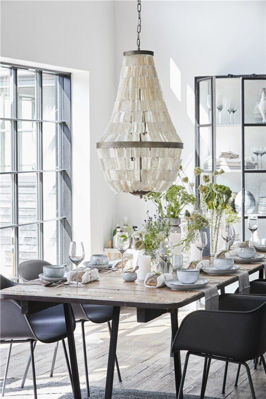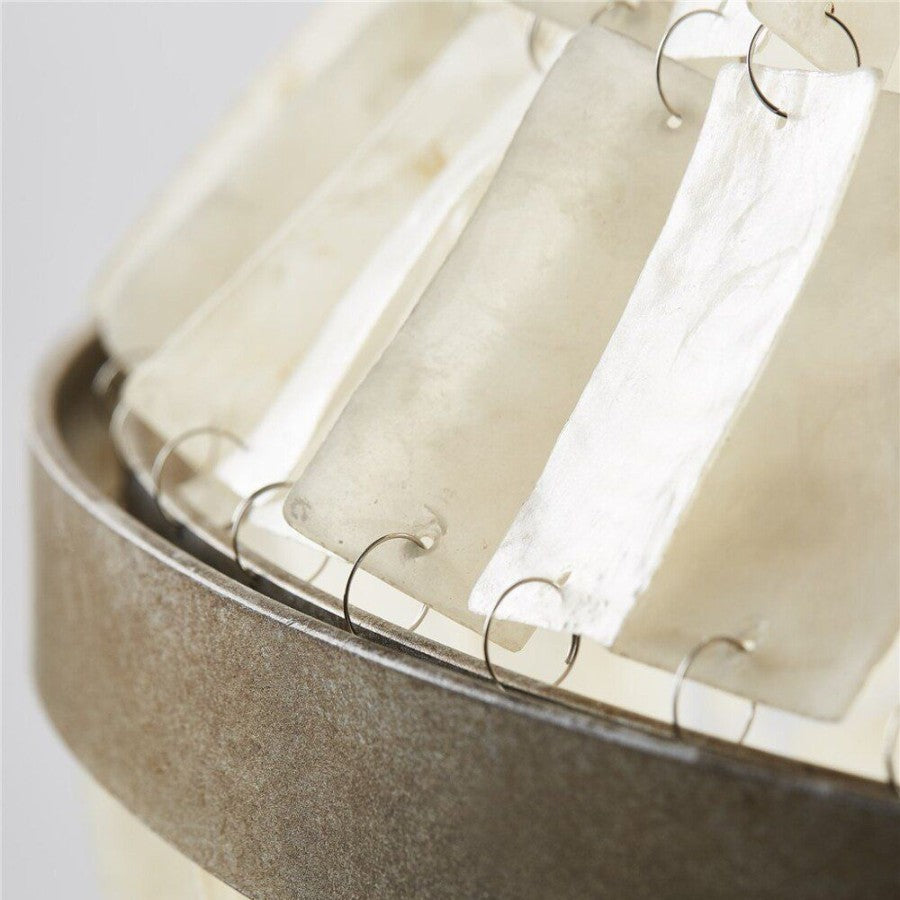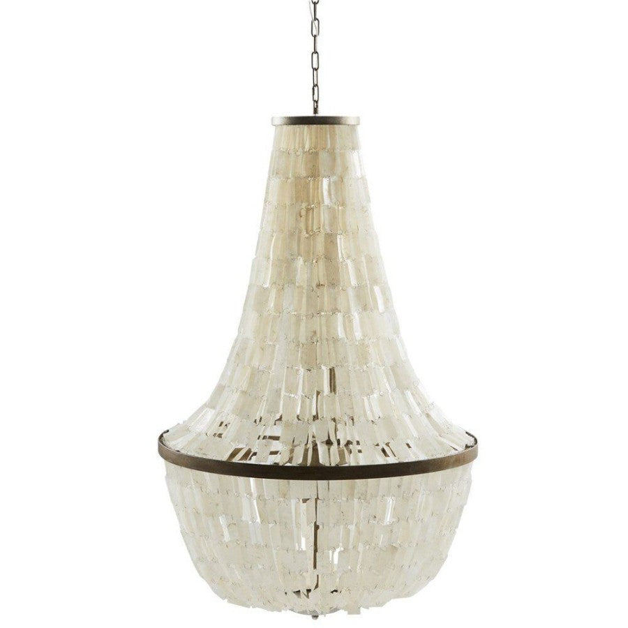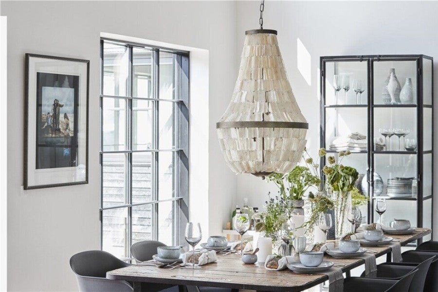Den eksklusive lysekronen Shea er laget av jern og vakre skjell fra Lene Bjerre. De vakre skjellene er fra Phuoc-øya i Vietnam og den spesielle produksjonsprosessen til skjellene er en lang prosess som gjøres for hånd av erfarne og dyktige håndverkere.
