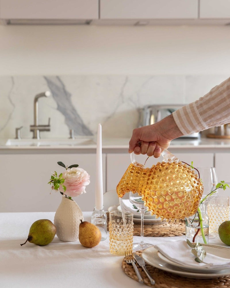 Den lekre karaffelen reflekterer lyset på en vakker måte og skaper en varm atmosfære for alle dine spesielle øyeblikk med familie og venner. Avsmalnende håndtak gir deg et komfortabelt grep på karaffelen, mens isleppen holder tilbake isbiter.