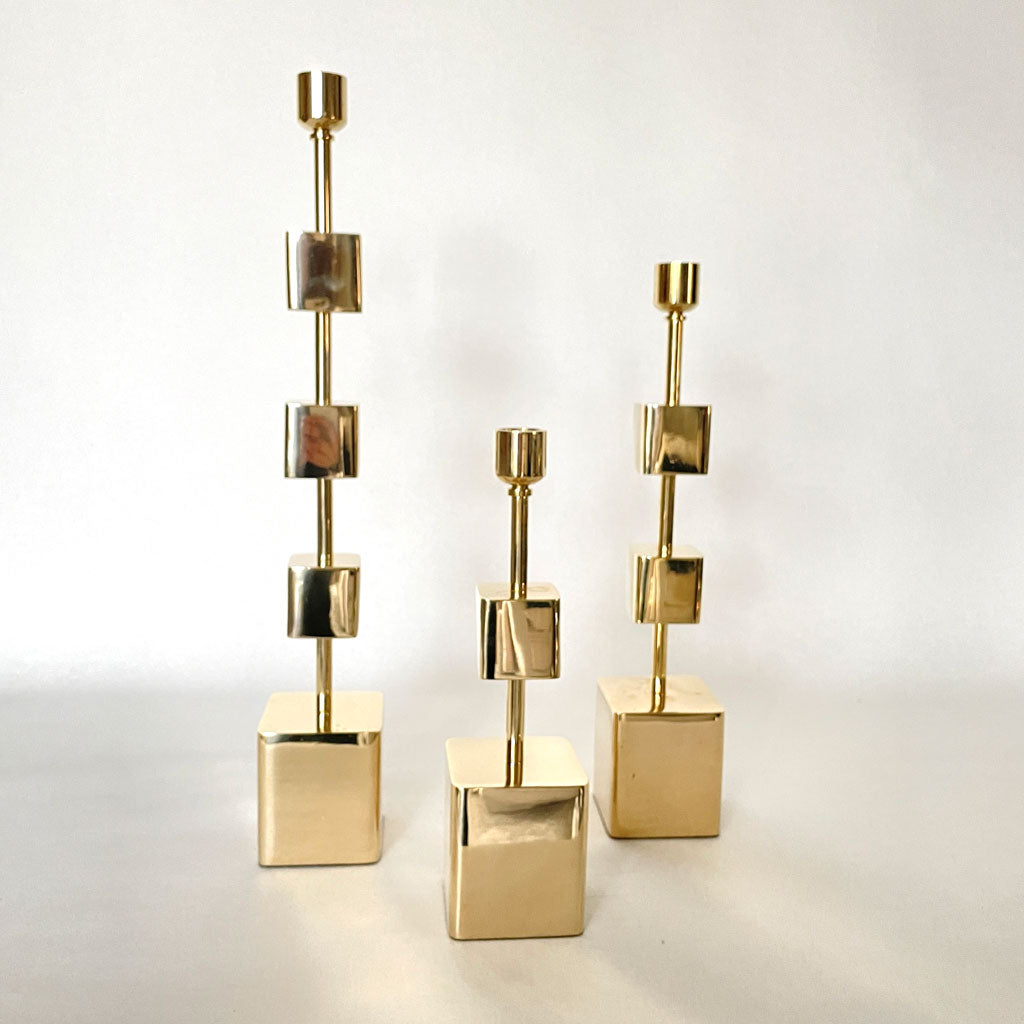 Flott håndlaget lysestake i messing med 1 firkant fra Frejas Boning. Den er lekker å kombinere med en av de andre lysestakene i serien eller to like for forsterket effekt. Lysestaken er i midten i bildet.