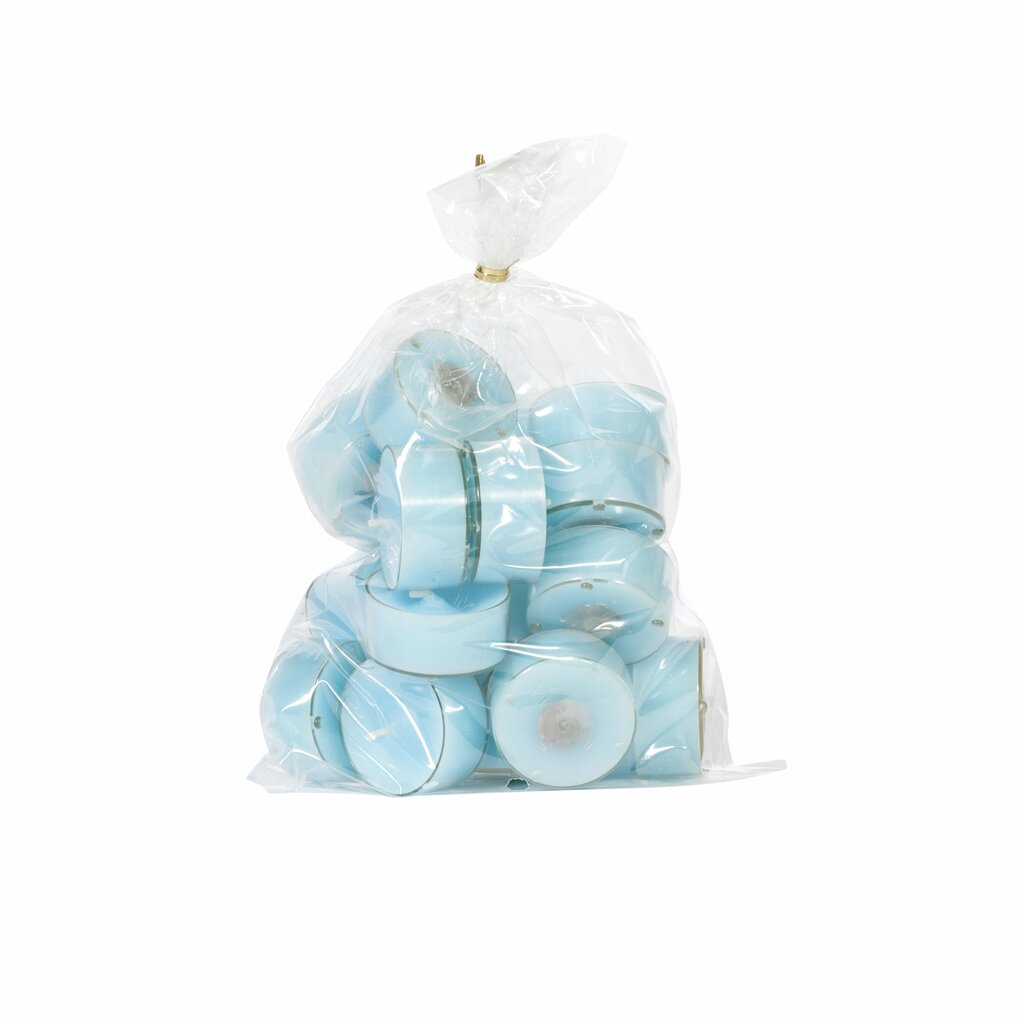 20 stk babyblå telys i pose. Plastkopp er gjennomsiktig så fargen på lyset sees. Brennetiden er 4 timer.