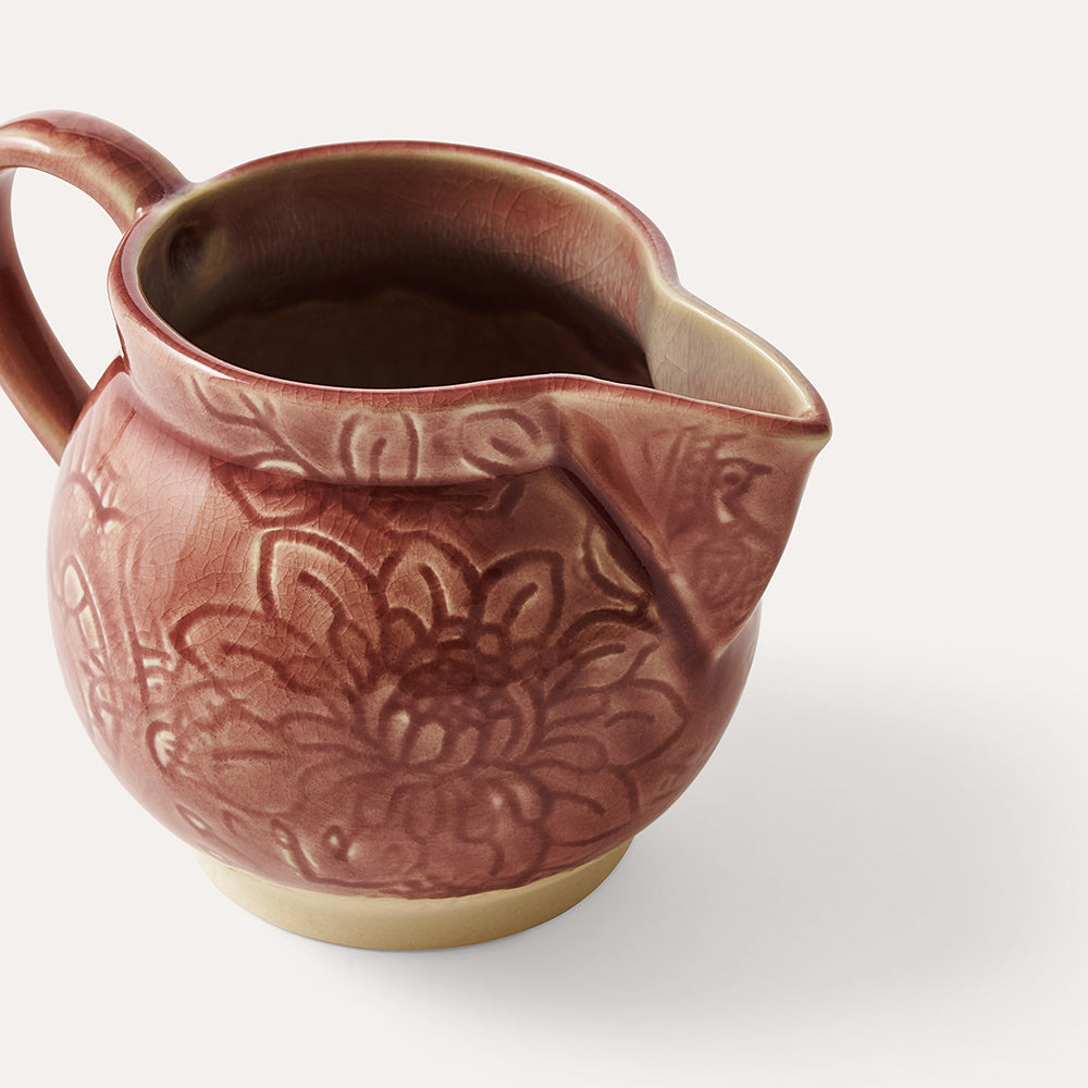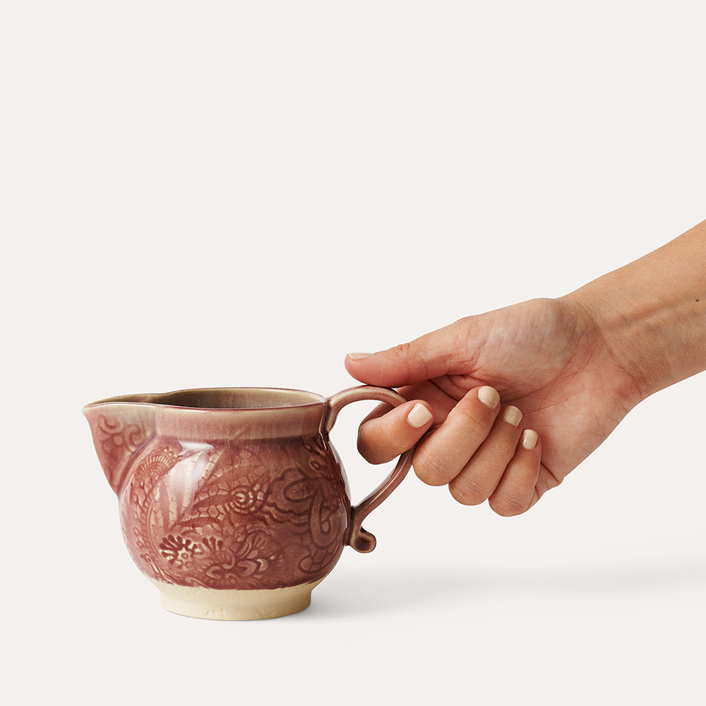 Den vakre fløtemuggen kommer fra Sthåls vakre serie Arabesque. Navnet arabesk kommer fra fransk og betyr arabisk. Det er også et spesielt kunstnerisk uttrykk med sløyfemønstre av planter, blader og bekker. Alle delene er produsert i hvitt steingods leire som er brent ved veldig høy temperatur, slik at keramikken blir holdbar. De vakre glasurene er nøye valgt for å få maten til å se appetittvekkende ut.
