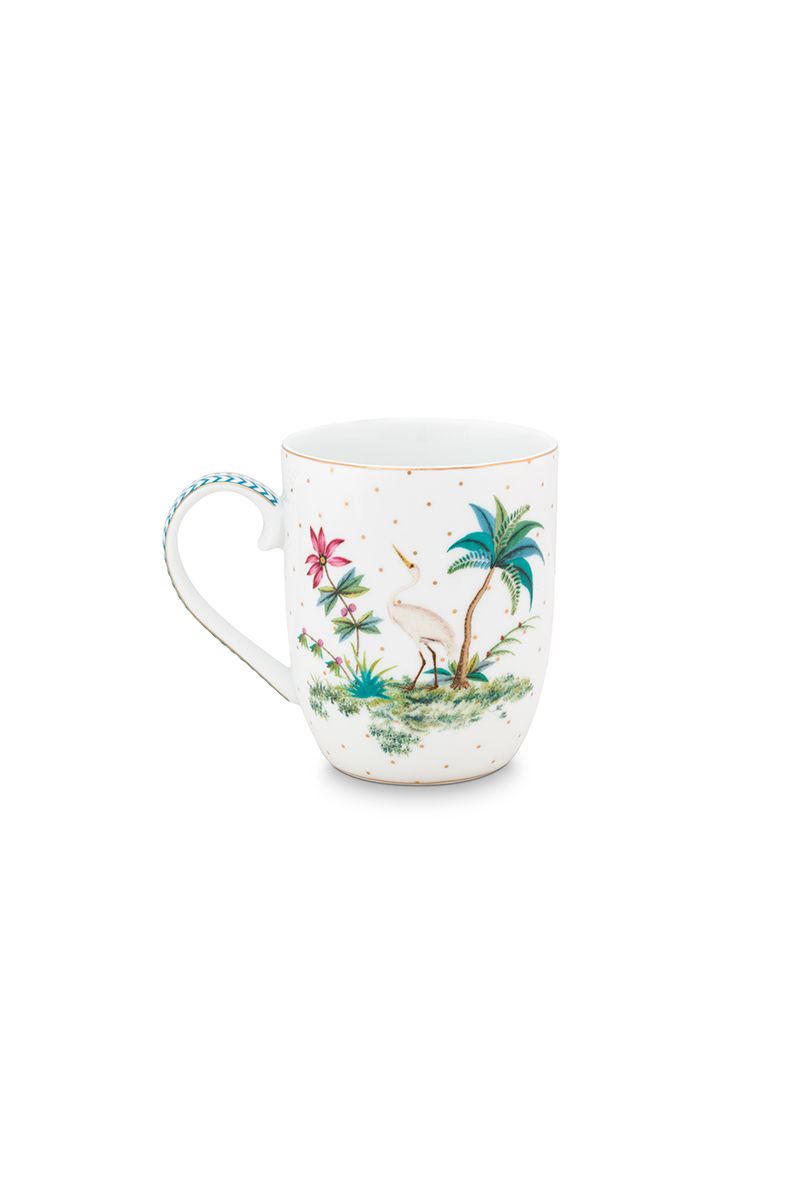 Lekkert krus i Jolie fra Pip Studio. Det vakre kruset har en hvit bakgrunn med gylne prikker. Se for deg selv på en tropisk øy og ta en titt på palmene og de tropiske plantene som er dekorert på kruset. Håndtaket på kruset er dekorert med elegante blå detaljer.