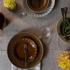 Den vakre ovale fatet Tulipa Umbra fra PotteryJo er håndlaget i Portugal av ovnsikkert steintøy. Fatet er i lekker brun farge med vakker mønsterkant.