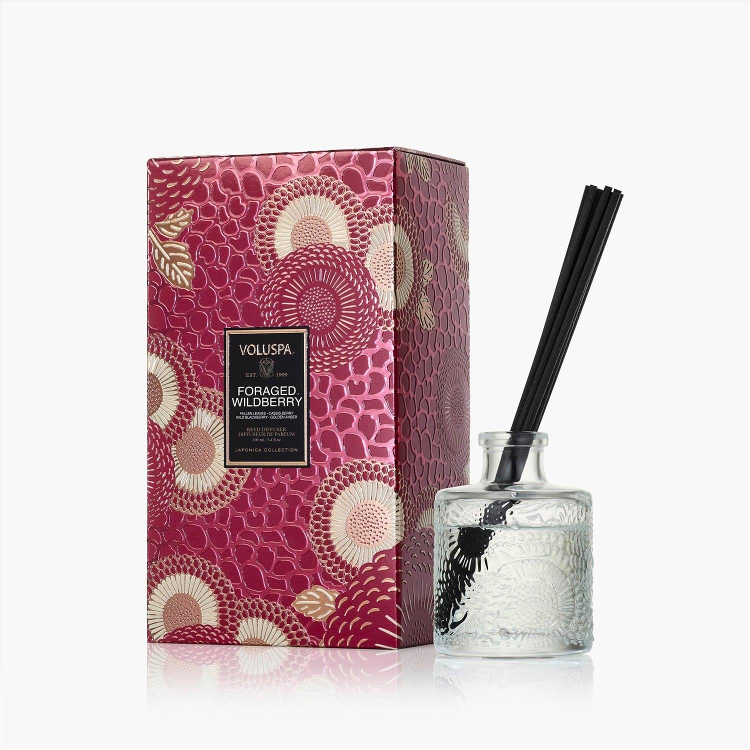 Delikate duftpinner fra Voluspa med en duft av høstblader, solbær, bjørnebær og gyllen rav. Duftpinnene kommer i en i glass beholder fra amerikanske Volusspa og er produsert i USA.