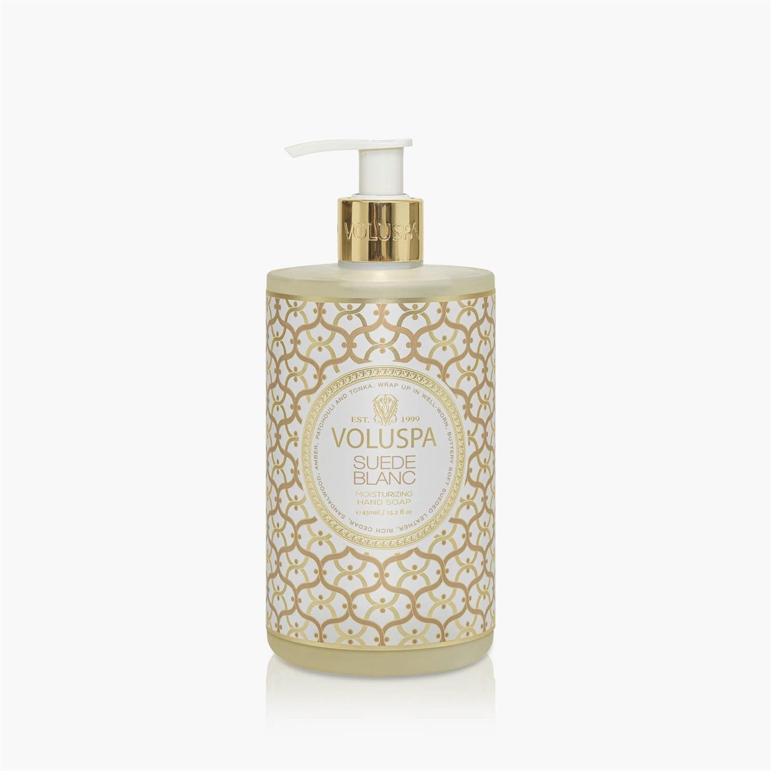 Delikat håndsåpe fra Voluspa i lekker flaske som er elegant på kjøkkenet eller badet. Håndsåpen har duft av semsket skinn, rav og sedertre.