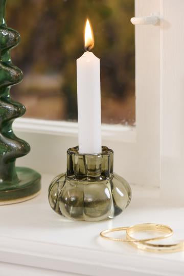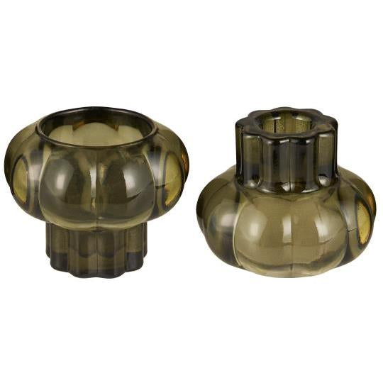 Vakker og praktisk lysestake Fleur i glass som kan brukes til kronelys på 2,2 cm og telys på hver side.