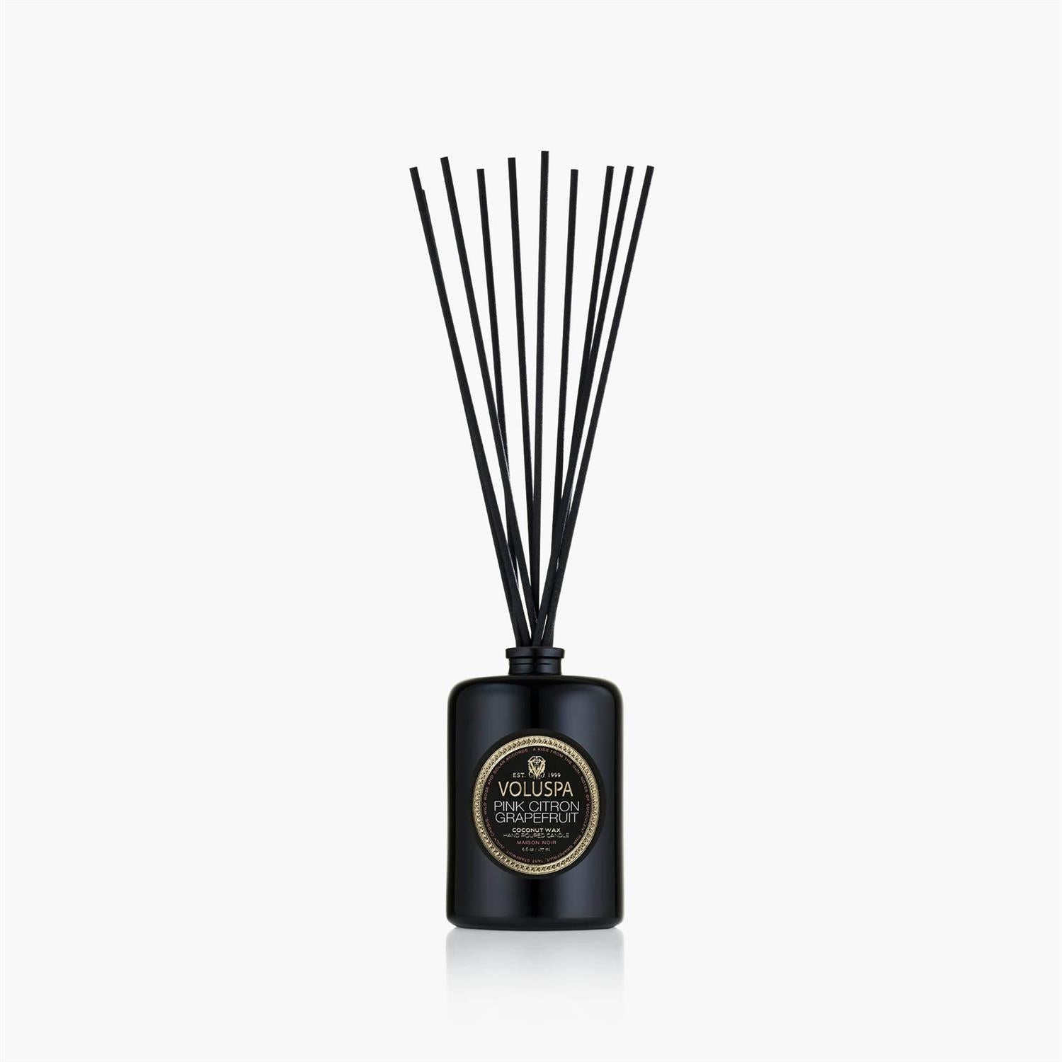 Delikate duftpinner med en duft av sitron, grapefrukt, solbær og delikat rose. Duftpinnene kommer i en i glass beholder fra amerikanske Voluspa og er produsert i USA.