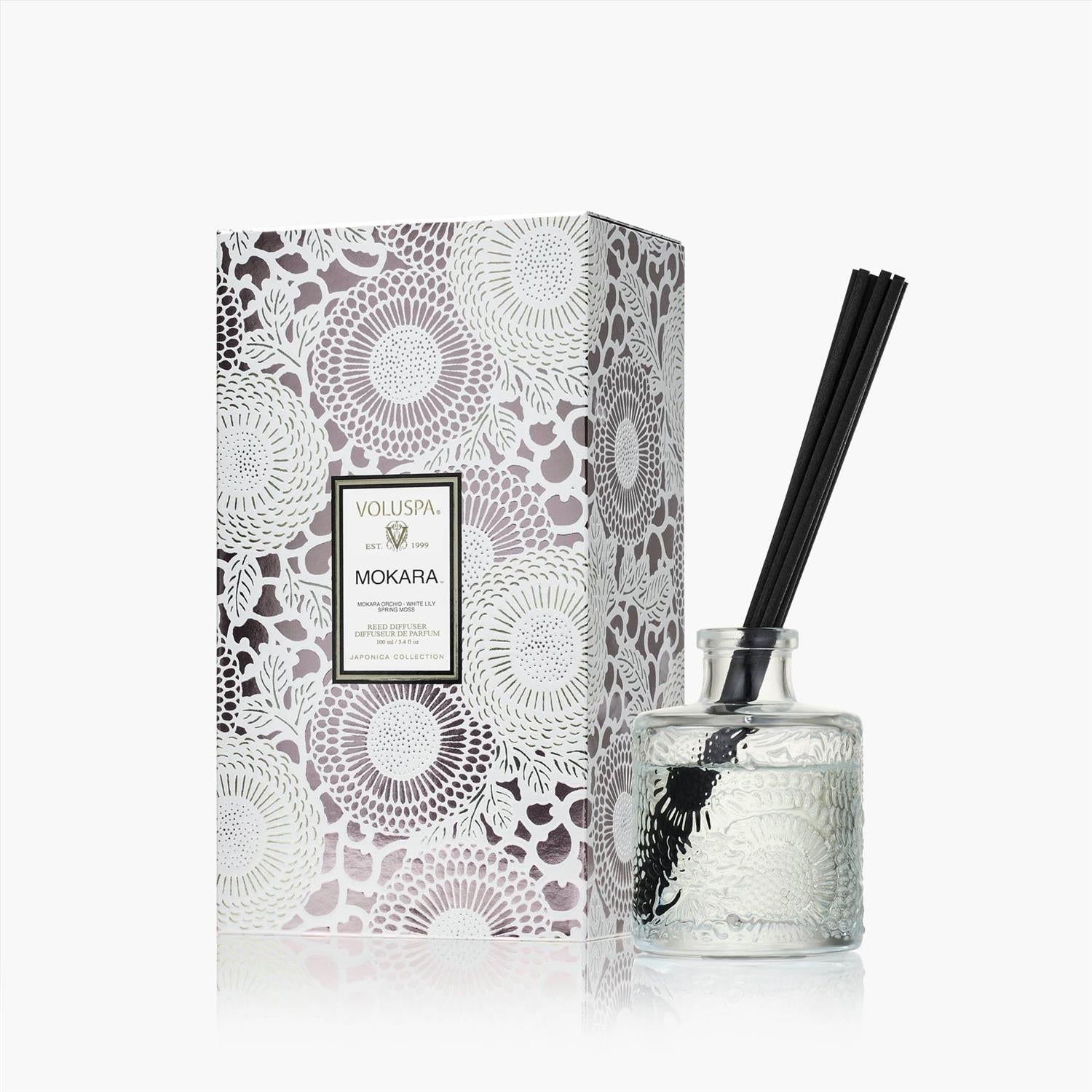Delikate duftpinner fra Voluspa med en duft av orkide, hvit lilje og vårmose. Duftpinnene kommer i en i glass beholder fra amerikanske Voluspa og er produsert i USA.