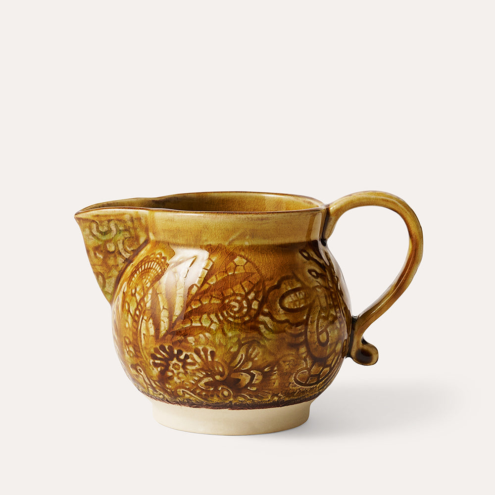 Den vakre fløtemuggen kommer fra Sthåls vakre serie Arabesque. Navnet arabesk kommer fra fransk og betyr arabisk. Det er også et spesielt kunstnerisk uttrykk med sløyfemønstre av planter, blader og bekker. Alle delene er produsert i hvitt steingods leire som er brent ved veldig høy temperatur, slik at keramikken blir holdbar. De vakre glasurene er nøye valgt for å få maten til å se appetittvekkende ut.