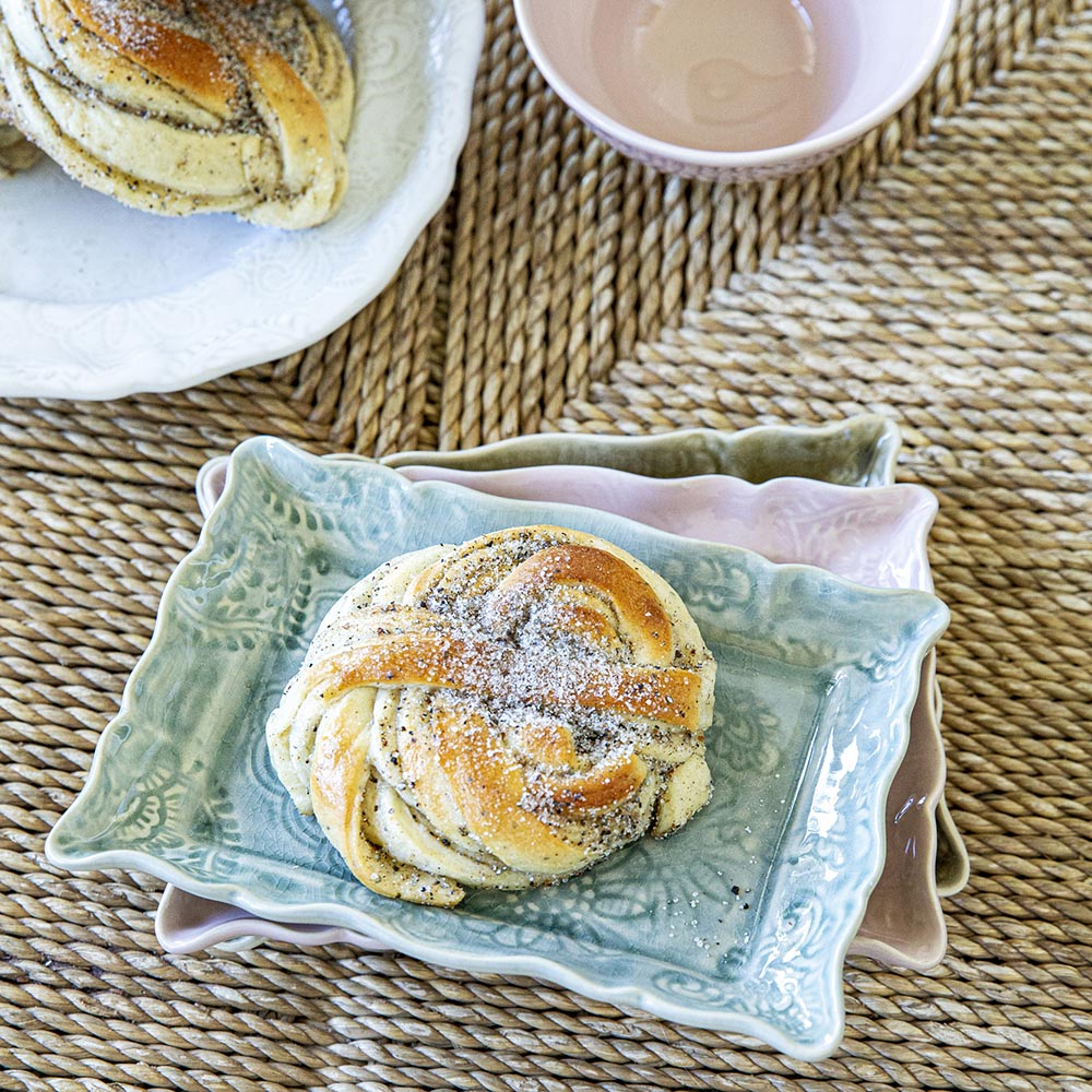 Den vakre asjetten kommer fra Sthåls vakre serie Arabesque. Navnet arabesk kommer fra fransk og betyr arabisk. Det er også et spesielt kunstnerisk uttrykk med sløyfemønstre av planter, blader og bekker. Alle delene er produsert i hvitt steingods leire som er brent ved veldig høy temperatur, slik at keramikken blir holdbar. De vakre glasurene er nøye valgt for å få maten til å se appetittvekkende ut.