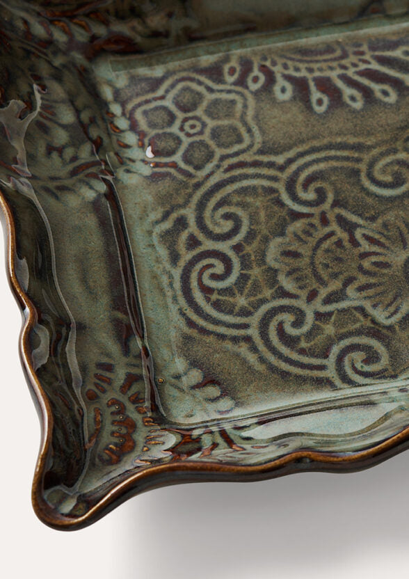 Den vakre asjetten kommer fra Sthåls vakre serie Arabesque. Navnet arabesk kommer fra fransk og betyr arabisk. Det er også et spesielt kunstnerisk uttrykk med sløyfemønstre av planter, blader og bekker. Alle delene er produsert i hvitt steingods leire som er brent ved veldig høy temperatur, slik at keramikken blir holdbar. De vakre glasurene er nøye valgt for å få maten til å se appetittvekkende ut.