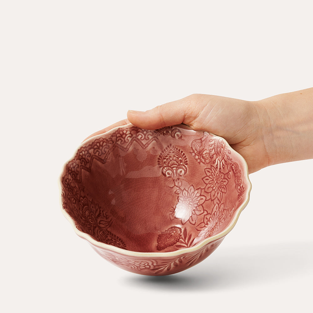 Den vakre skålen/suppebollen kommer fra Sthåls flotte serie Arabesque. Navnet arabesk kommer fra fransk og betyr arabisk. Det er også et spesielt kunstnerisk uttrykk med sløyfemønstre av planter, blader og bekker. Alle delene er produsert i hvitt steingods leire som er brent ved veldig høy temperatur, slik at keramikken blir holdbar. De vakre glasurene er nøye valgt for å få maten til å se appetittvekkende ut.