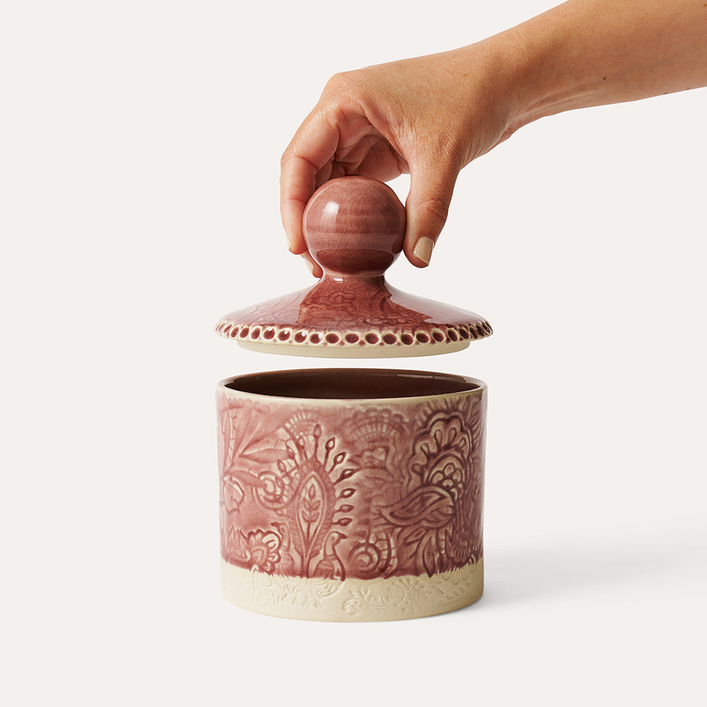 Den vakre tea caddyen kommer fra Sthåls flotte serie Arabesque. Navnet arabesk kommer fra fransk og betyr arabisk. Det er også et spesielt kunstnerisk uttrykk med sløyfemønstre av planter, blader og bekker. Alle delene er produsert i hvitt steingods leire som er brent ved veldig høy temperatur, slik at keramikken blir holdbar. De vakre glasurene er nøye valgt for å få maten til å se appetittvekkende ut.