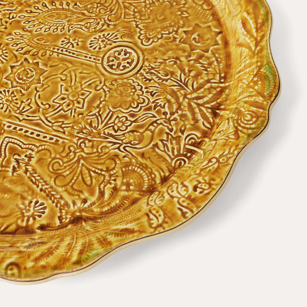 Det vakre serveringsfatet/ pizzafatet kommer fra Sthåls vakre serie Arabesque. Navnet arabesk kommer fra fransk og betyr arabisk. Det er også et spesielt kunstnerisk uttrykk med sløyfemønstre av planter, blader og bekker. Alle delene er produsert i hvitt steingods leire som er brent ved veldig høy temperatur, slik at keramikken blir holdbar. De vakre glasurene er nøye valgt for å få maten til å se appetittvekkende ut.