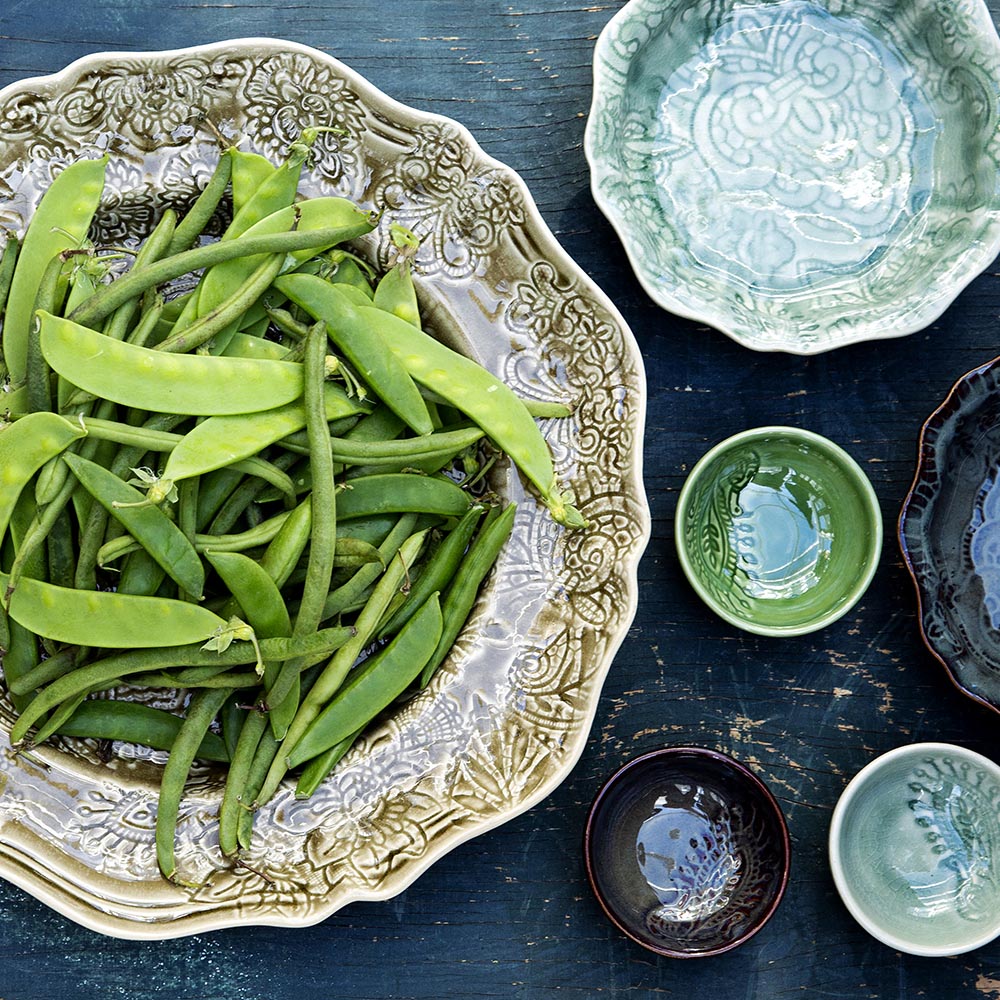 Det vakre serveringsfatet kommer fra Sthåls vakre serie Arabesque. Navnet arabesk kommer fra fransk og betyr arabisk. Det er også et spesielt kunstnerisk uttrykk med sløyfemønstre av planter, blader og bekker. Alle delene er produsert i hvitt steingods leire som er brent ved veldig høy temperatur, slik at keramikken blir holdbar. De vakre glasurene er nøye valgt for å få maten til å se appetittvekkende ut.