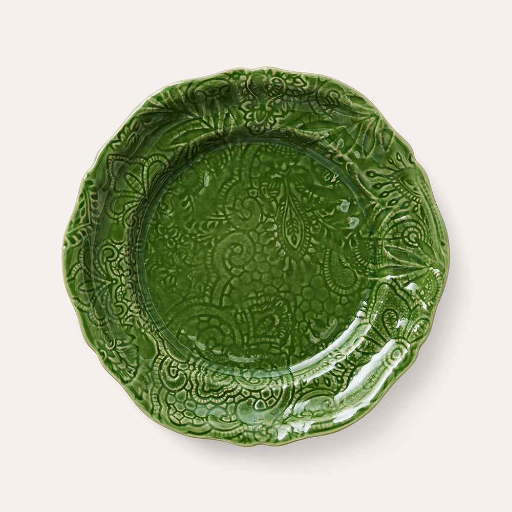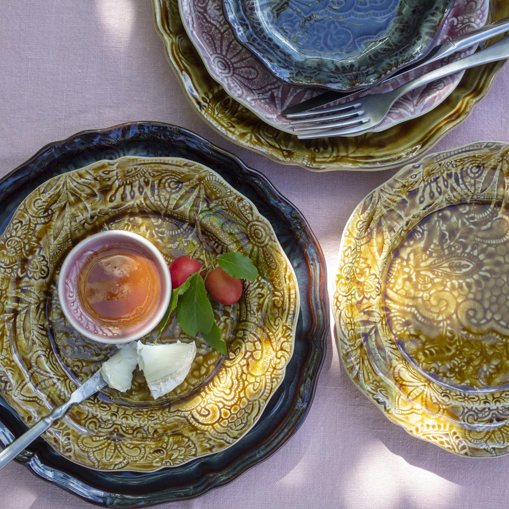 Den vakre tallerken på 23 cm kommer fra Sthåls vakre serie Arabesque. Navnet arabesk kommer fra fransk og betyr arabisk. Det er også et spesielt kunstnerisk uttrykk med sløyfemønstre av planter, blader og bekker. Alle delene er produsert i hvitt steingods leire som er brent ved veldig høy temperatur, slik at keramikken blir holdbar. De vakre glasurene er nøye valgt for å få maten til å se appetittvekkende ut.