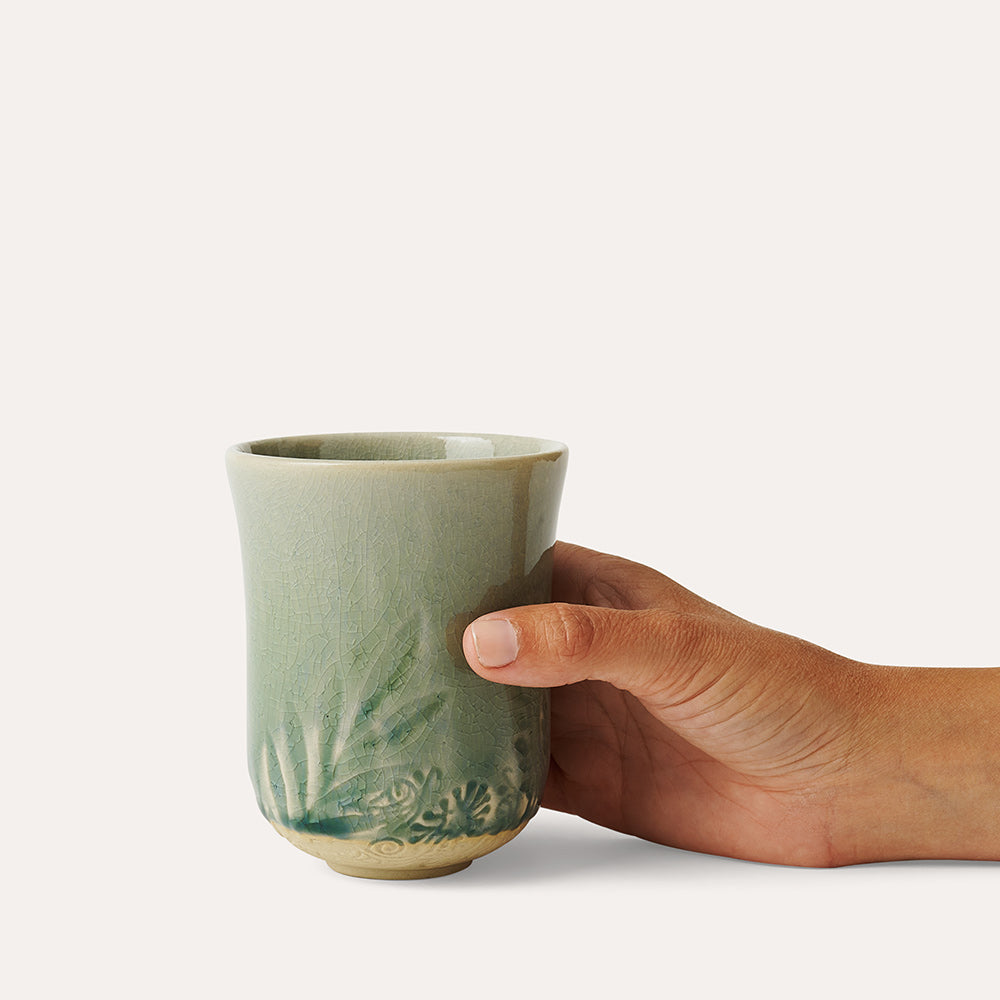 Den vakre latte koppen på 3 dl kommer fra Sthåls vakre serie Arabesque. Navnet arabesk kommer fra fransk og betyr arabisk. Det er også et spesielt kunstnerisk uttrykk med sløyfemønstre av planter, blader og bekker. Alle delene er produsert i hvitt steingods leire som er brent ved veldig høy temperatur, slik at keramikken blir holdbar. De vakre glasurene er nøye valgt for å få maten til å se appetittvekkende ut.