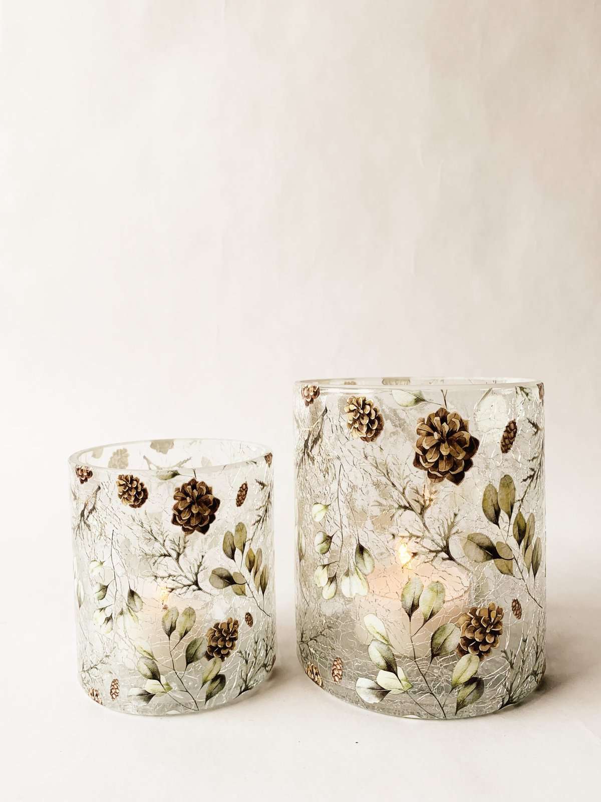 Vakkert lysglass med naturmotiv med kongler og blader fra Trend Design i krakelert glass. Lysglasset er 11,5 x 13 cm - det er til høyre i bildet.