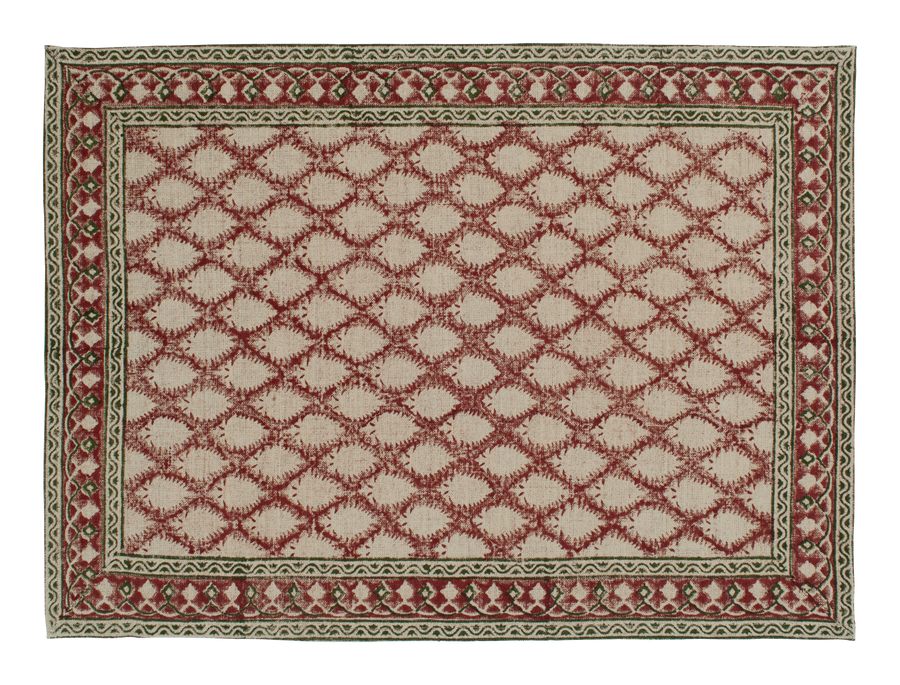 Elegant spisebrikke Cypress fra Chamois i lin. Mønsteret er trykket for hånd med tradisjonell indisk blokktrykkteknikk. Den håndlagde teknikken gjør hver bordbrikke unik, og gir et levende, harmonisk og dekorativt uttrykk.