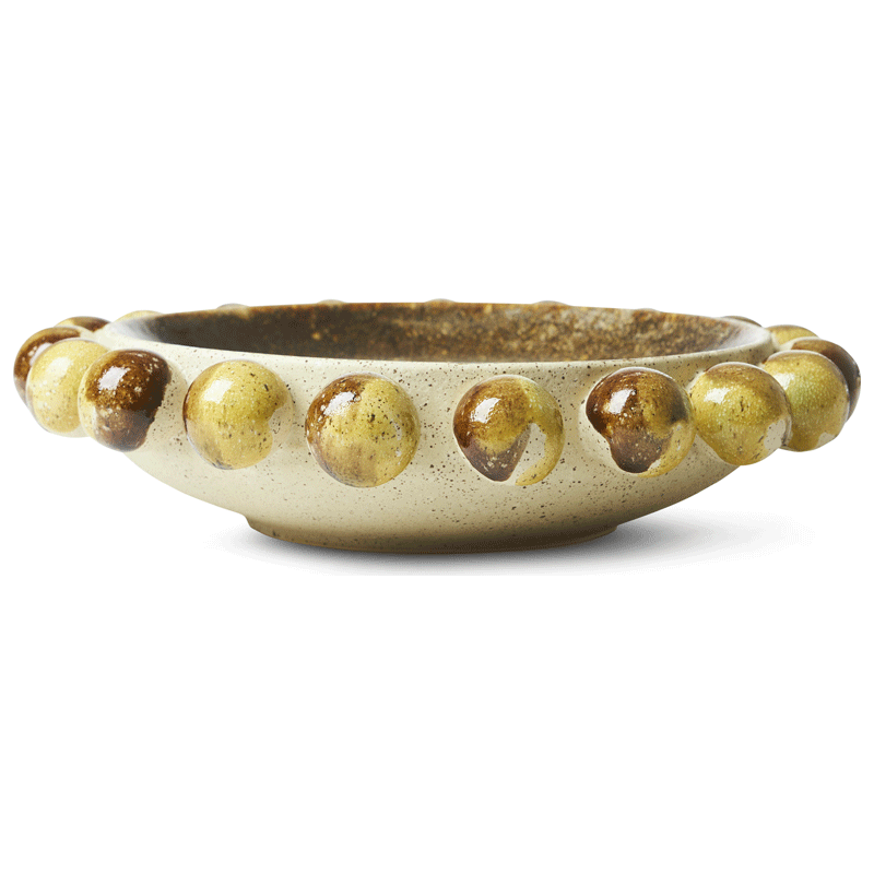 Forvandle bordet ditt til et kunstnerisk fristed med Zaeli skålen fra Jakobsdals. Denne skålen kombinerer jordfarger harmonisk med dekorative kuler rundt kanten, noe som gir den en bohemsk og rustikk karakter. Zaeli er laget av steintøy med fokus på detaljer, og viser frem kvalitet og kunstnerisk sans. Hver dekorative kule er nøye plassert, noe som skaper et helhetlig og elegant utseende.