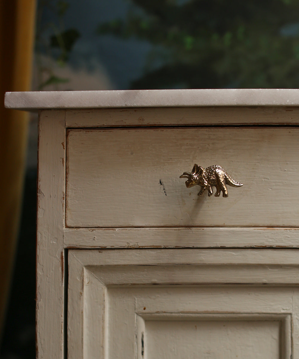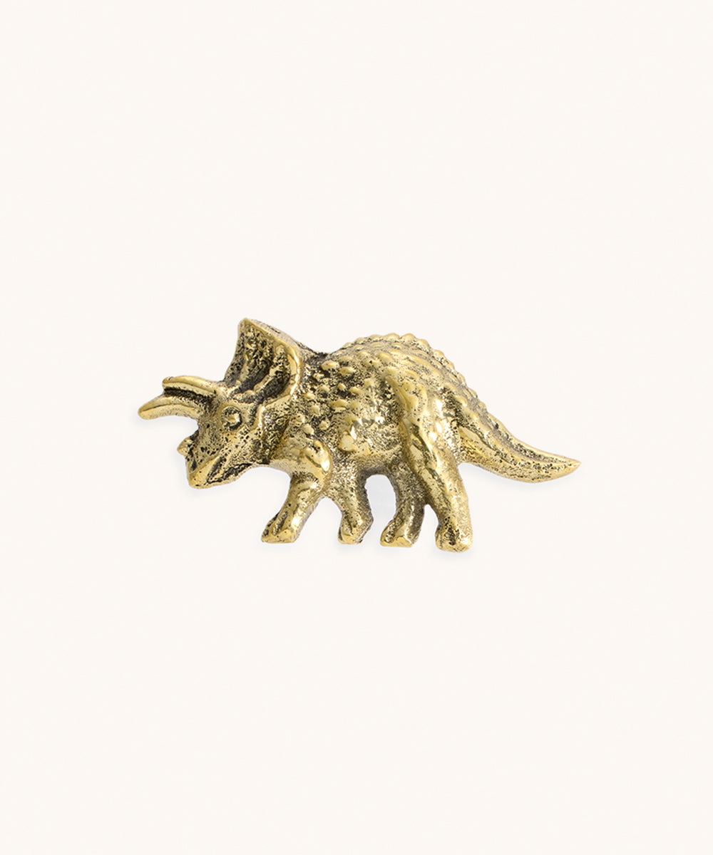 Oppdag den unike Triceratop knotten som er 100 % håndlaget i India i resirkulert messing. Formet som en sjarmerende triceratop tilfører knotten et sjarmerende og unikt element til interiøret. Opgrader garderoben, kommoden eller døren med knotten og få et nytt utseende på dine møbler.