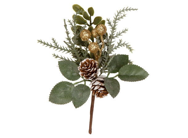 Kunstig grønn kvist med kongler og gullbær på 15x11 cm.