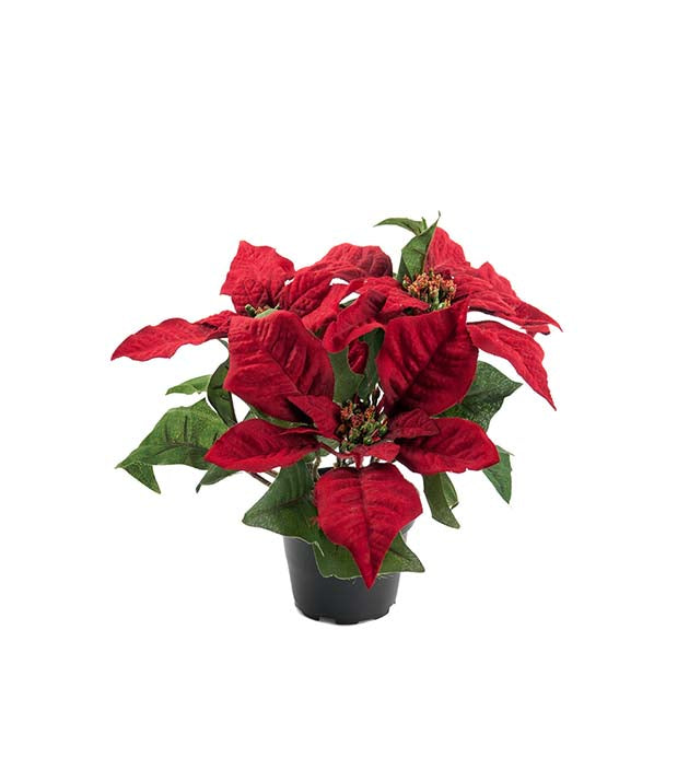 Vakker og naturtro kunstig rød julestjerne i potte på 23 cm fra Mr Plant.