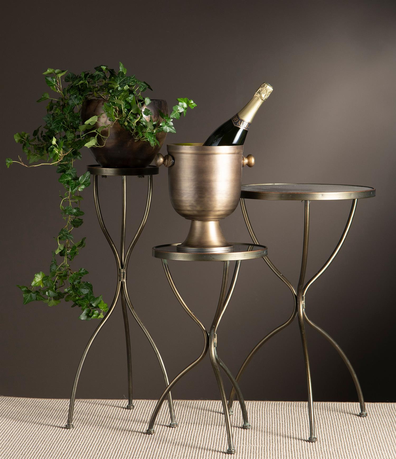 Introduser et snev av eleganse og funksjonalitet i hjemmet ditt med sidebordet/pidestall i antikk messing. Dette vakre møbelet kombinerer en solid metallramme med en stilig speiloverflate, noe som skaper et sofistikert og tidløst design som passer perfekt inn i enhver interiørstil.