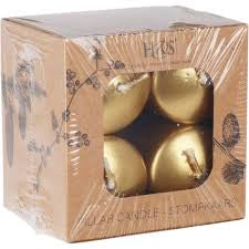 Dekorative små kubbelys i gull med metall finish på 4x6 cm. Det er 4 lys i pakken.