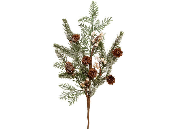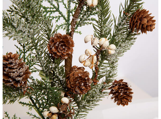 Kunstig grønn kvist med kongler og hvite bær på 40 cm fra Børscompagniet.