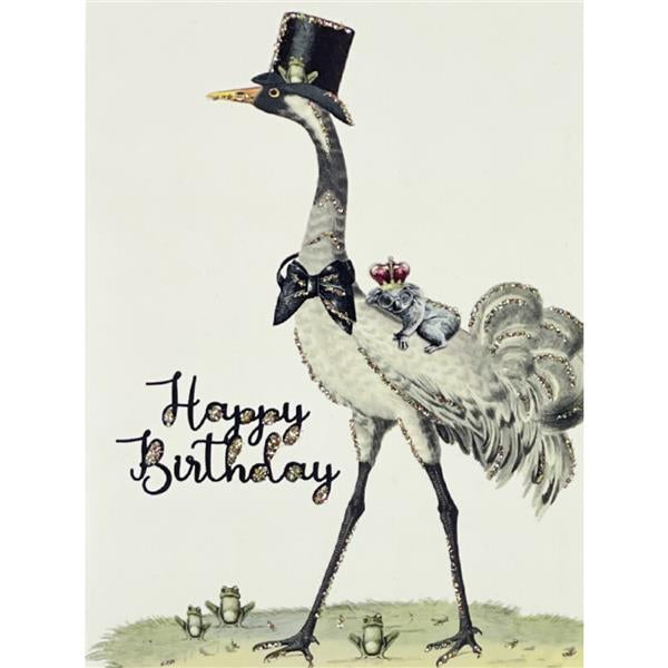Glitterkort Happy Birthday Fugl m/flosshatt