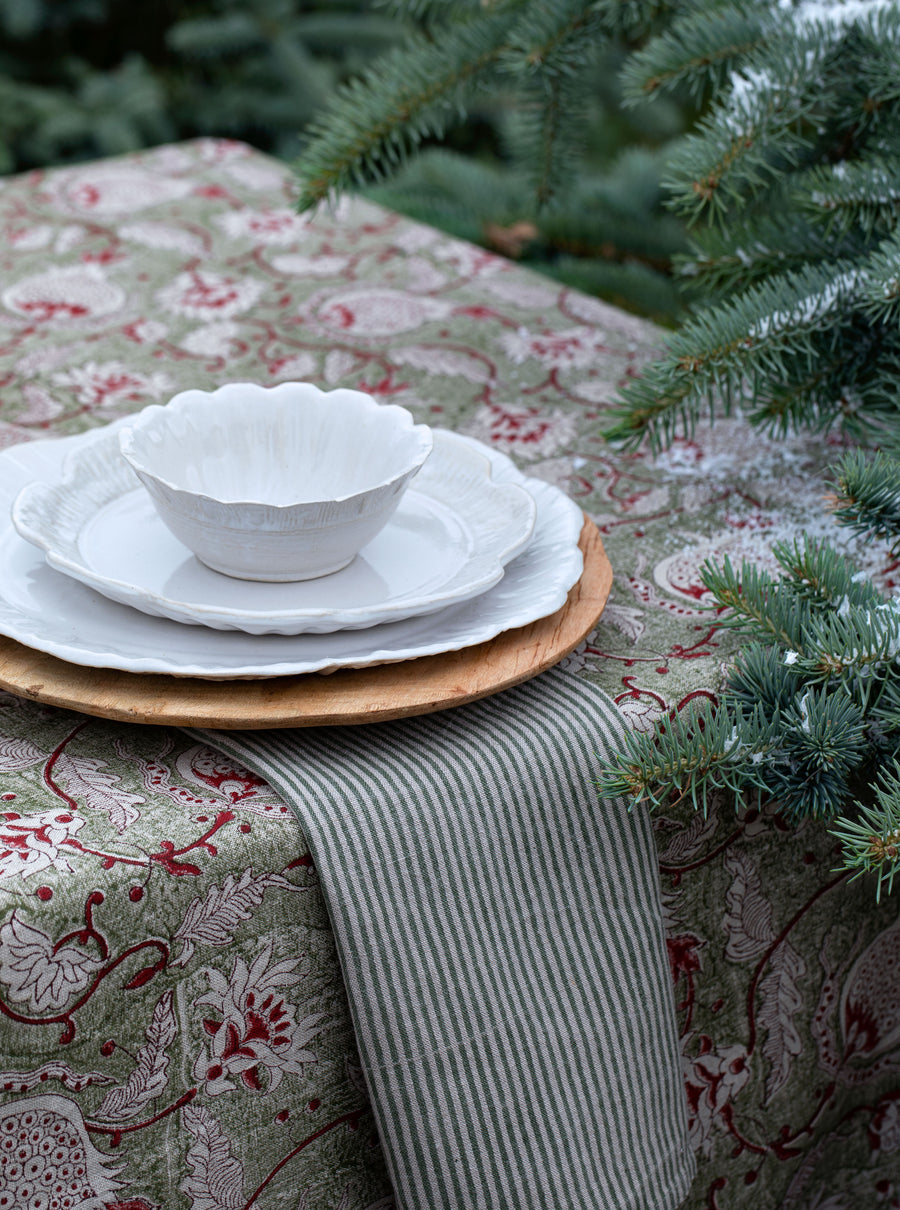 Duken Pomegrate Green fra Chamois er i 100 % lin med et elegant utrykk med granatepler i grønt og rødt. Duken er laget av høy kvalitets lin og er kuttet til størrelse før den er blokktrykket for hånd i India. En urgammel trykk teknikk gjør hver duk unik. Små variasjoner kan forekomme i trykket, et bevis på et ekte hånd trykt produkt.