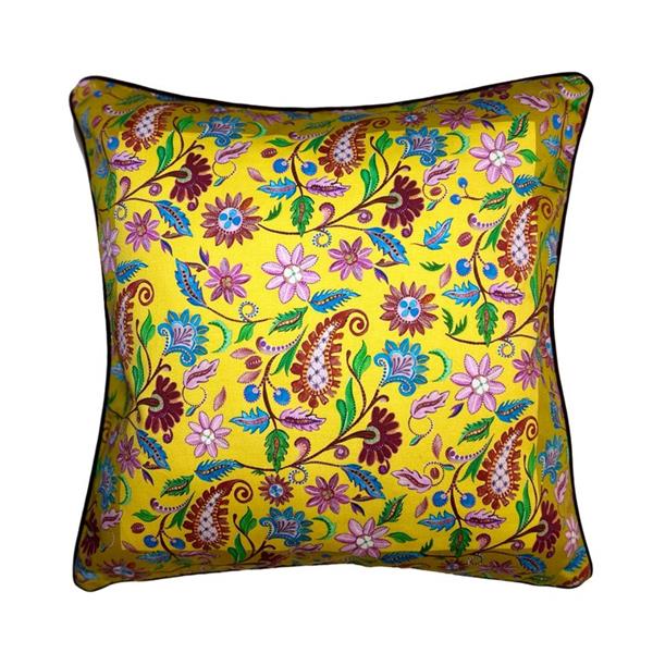 En eksklusiv håndlaget pute i glansfull bomullssateng, dekorert med et iøynefallende mønster inspirert av vintage eurasiatiske tekstiler.