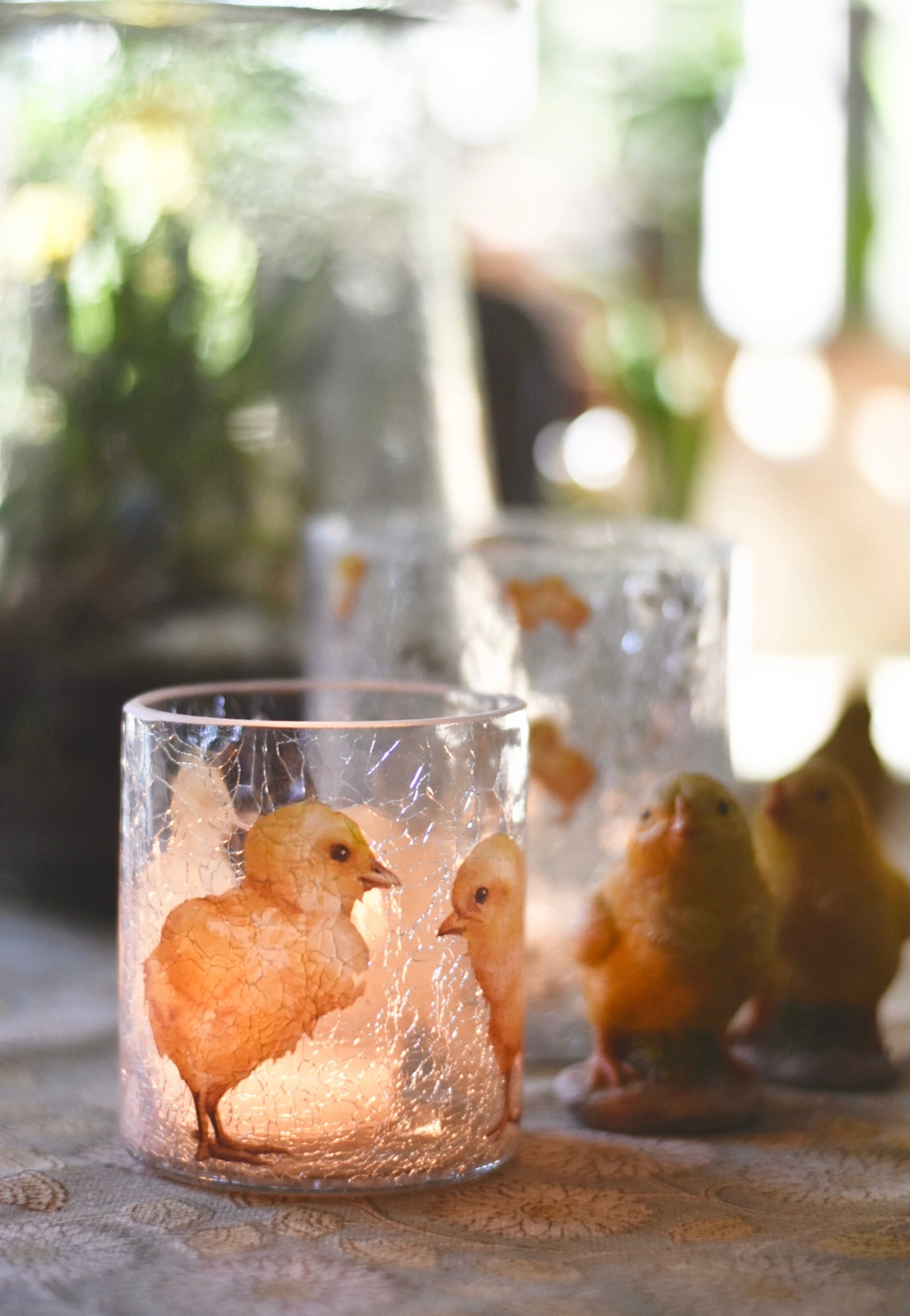 Vakkert håndlaget lysglass i krakelert glass med kyllinger fra Trend Design. Lysglasset er 9 x 10 cm - det er til venstre i bildet.