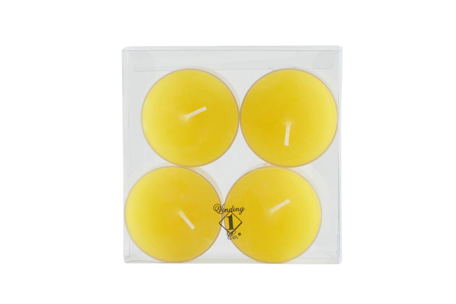 Flotte store telys fra Vinding i gul med gjennomsiktig kopp. Telysene er Ø6x2 cm og det er 4 telys i pakken.