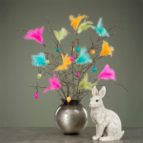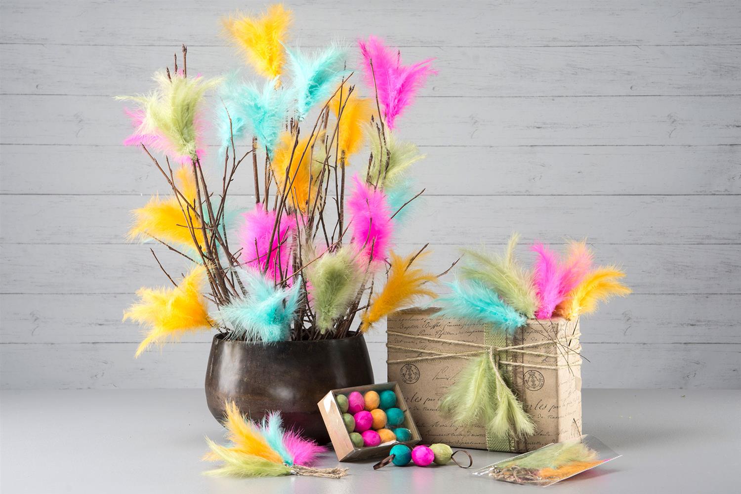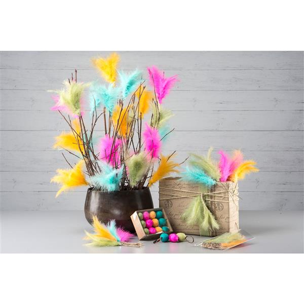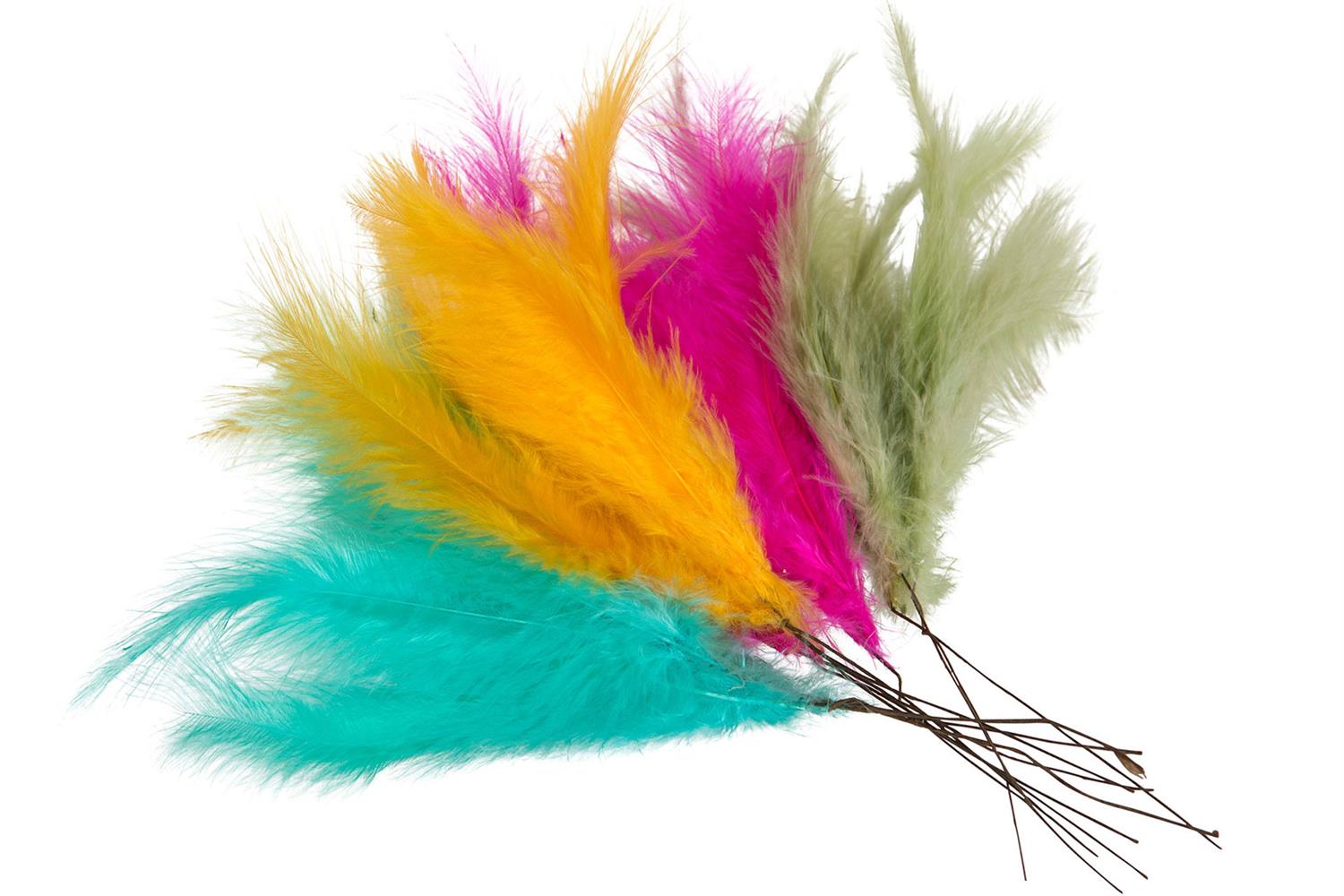 Vakre naturlige fjær i assosierte farger på 10 cm høyde med 12 stk i pakken.