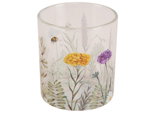 Sjarmerende lysglass med blomstereng. Lysglasset er 7x8 cm.