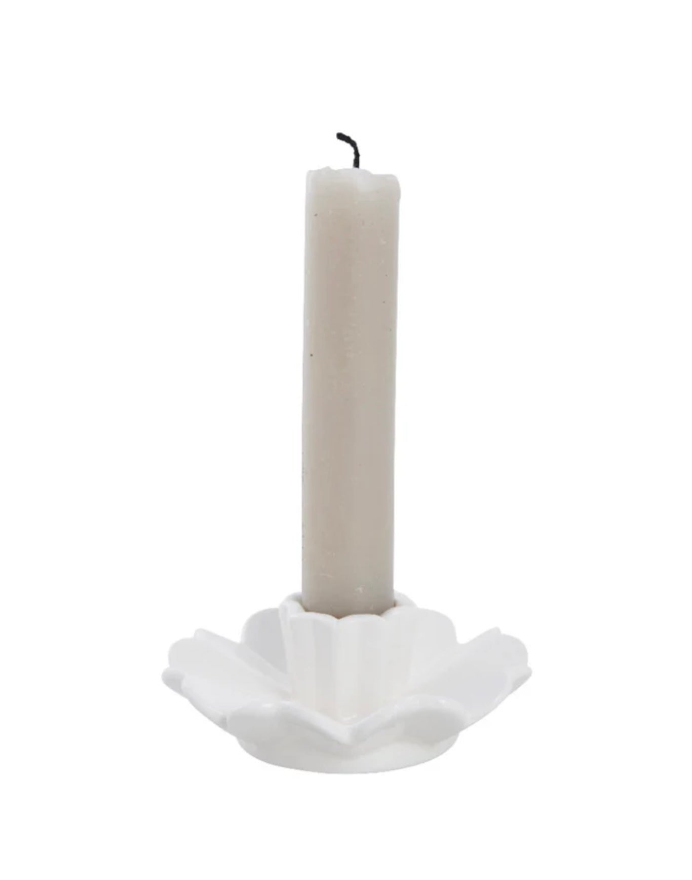 Vakre lysestake i keramikk, formet som en blomst med et vakkert rillemønster som gir den et raffinert og stilfullt utseende. Lysestaken har en solid base som sikrer stabilitet, og en liten holder for et vanlig stearinlys, noe som gjør den perfekt for å skape en koselig atmosfære.
