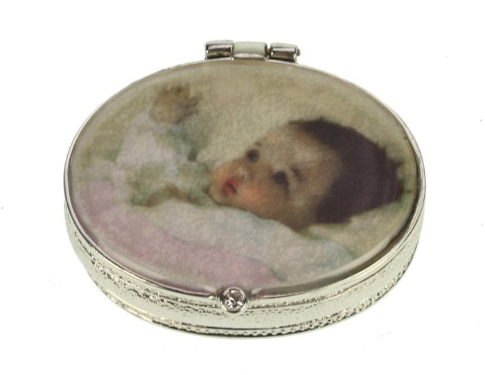 Nostalgisk sølv dekor boks med lyserosa baby med diameter på 5 cm. Boksen er håndlaget i Thailand.