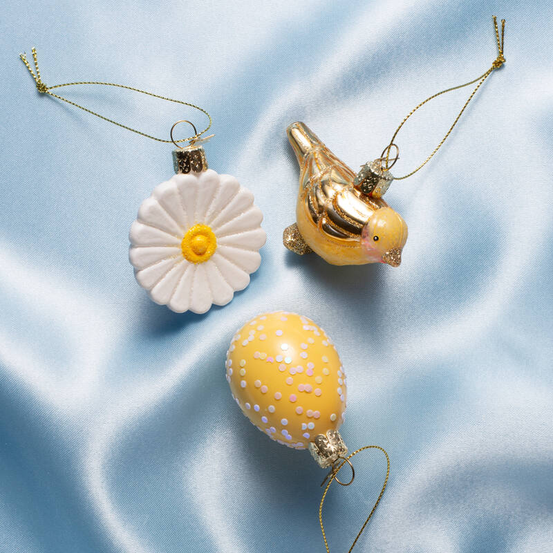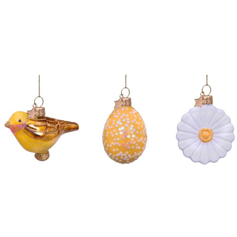Vondels vakre påskepynt Ornament glass Easter er laget av munnblåst glass som er håndmalt og dekorert med største omhu. Settet er med 3 figurer.