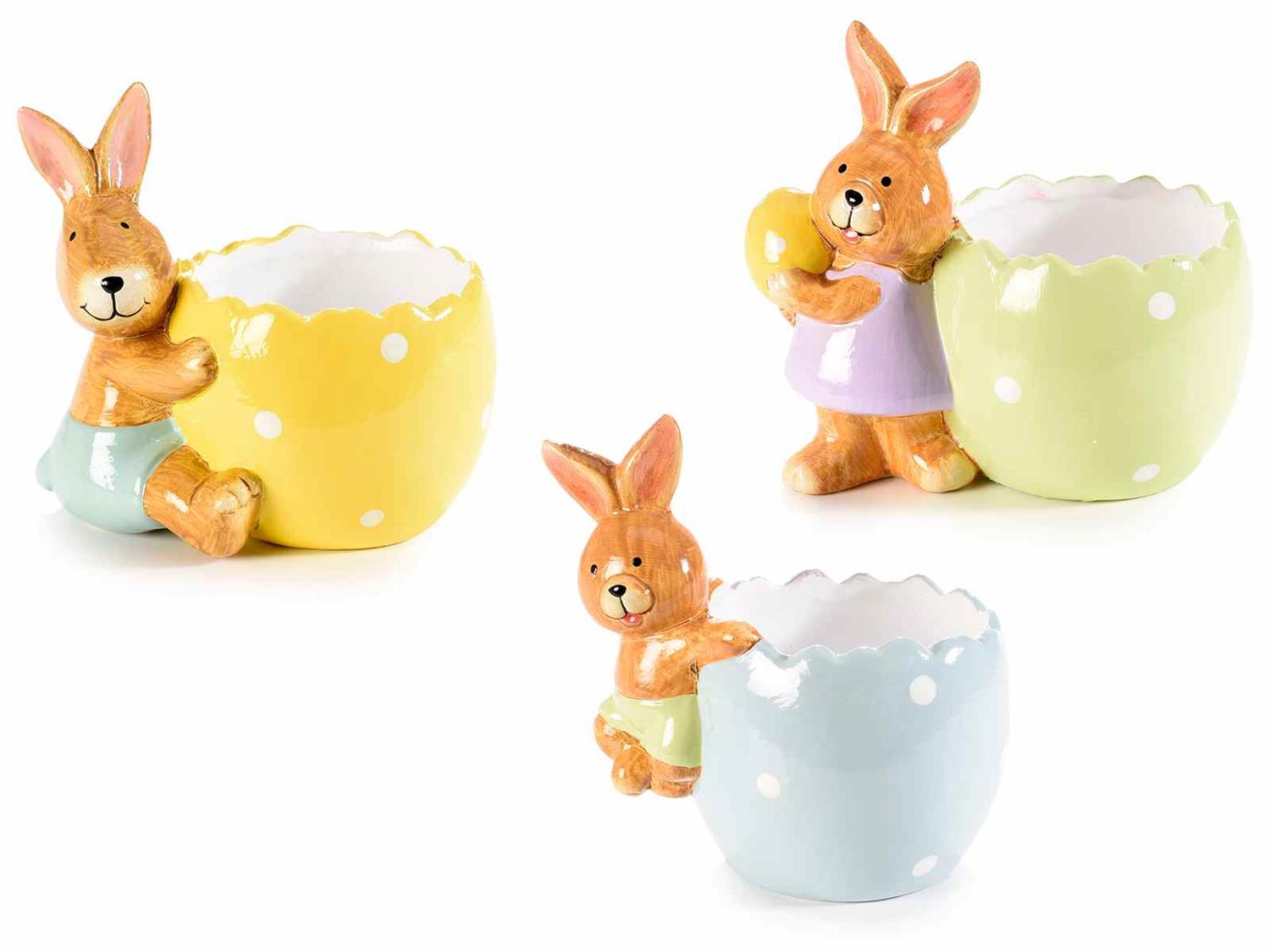 Sjarmerende malt terrakotta skål eller potte formet som et egg. Den er dekorerert med kanin og kommer i vakre pastell farger fra vår leverandør i Italia. Skålen er 11 cm høy, 12 cm lang og 8 cm bred. Det er påskekanin til venstre i gul. Pris per stk.