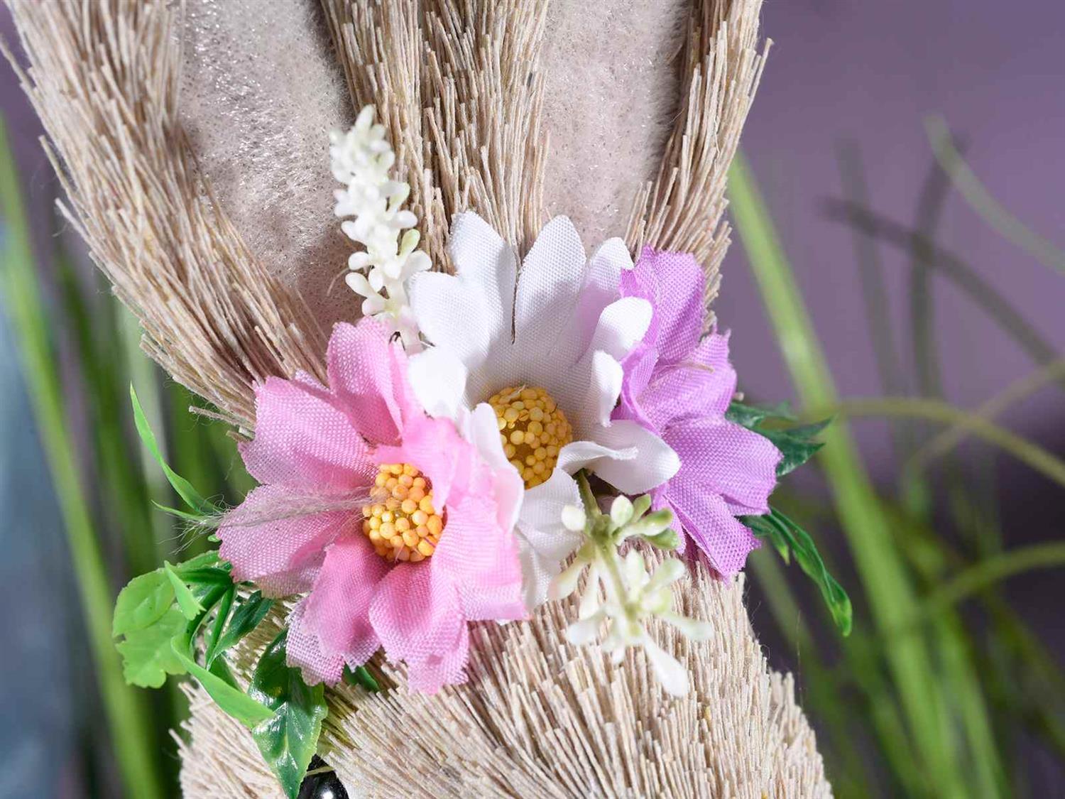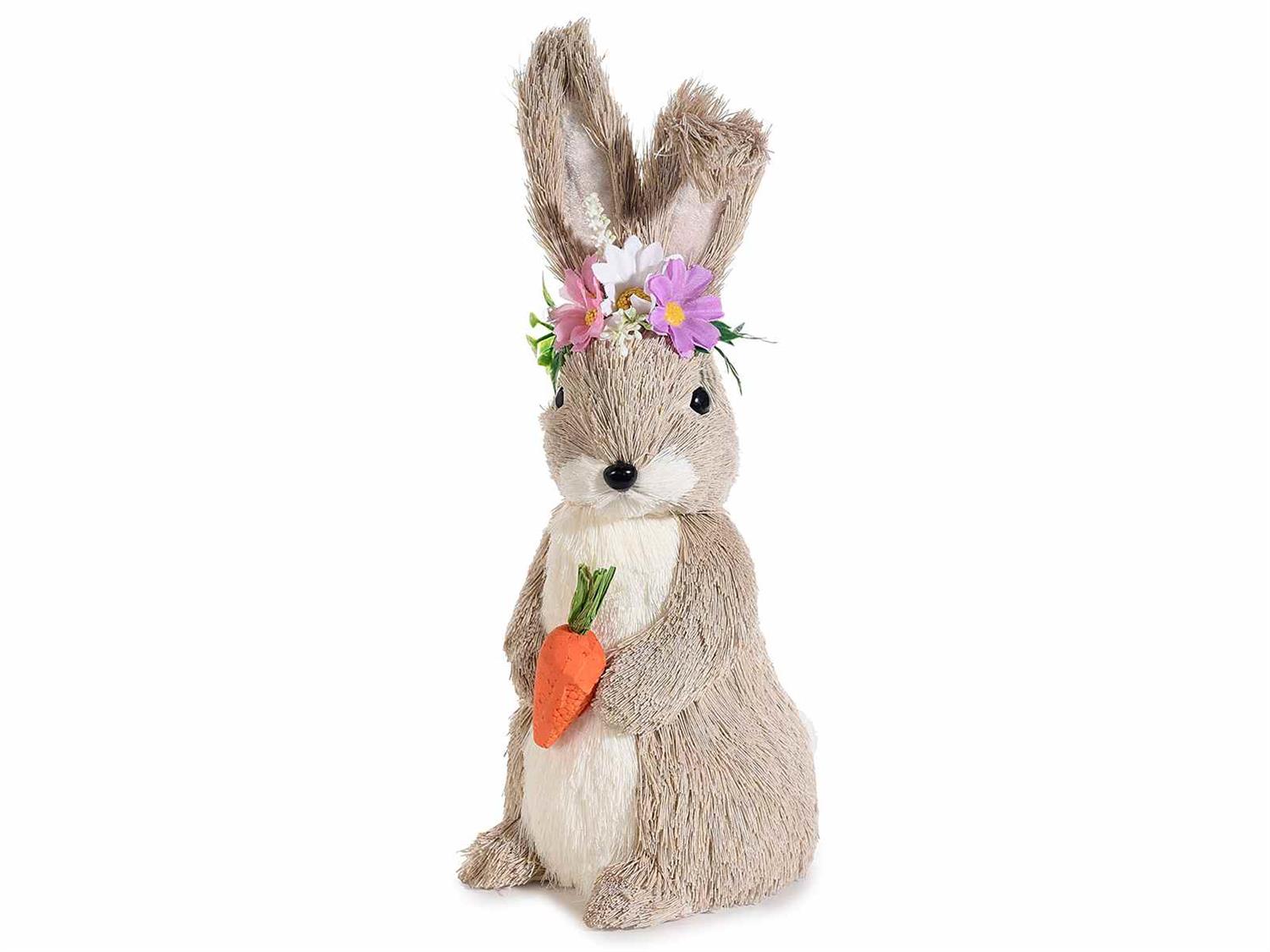 Naturlig stående påskehare i fiber med gulrot og blomsterkrone fra Italia. Haren har formbare ører og er hele 29 cm høy, 13 cm bred og 9,5 cm lang.