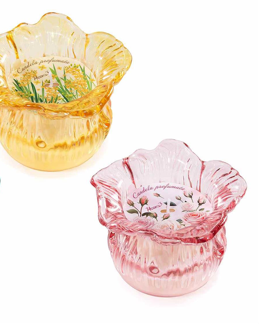 Skjønt rosa duftlys i glass skål formet som en blomst i vakker rosa pastellfarge. Duftlyset har en duft av rose og varer ca. 20 timer.