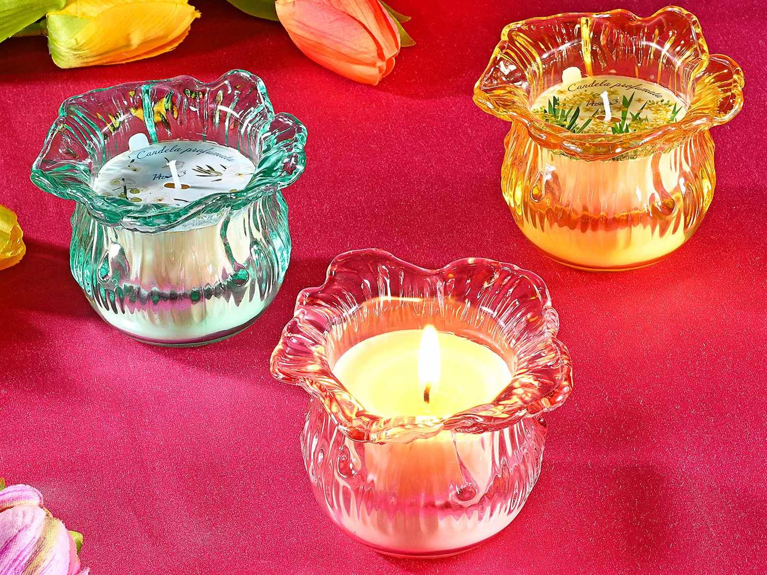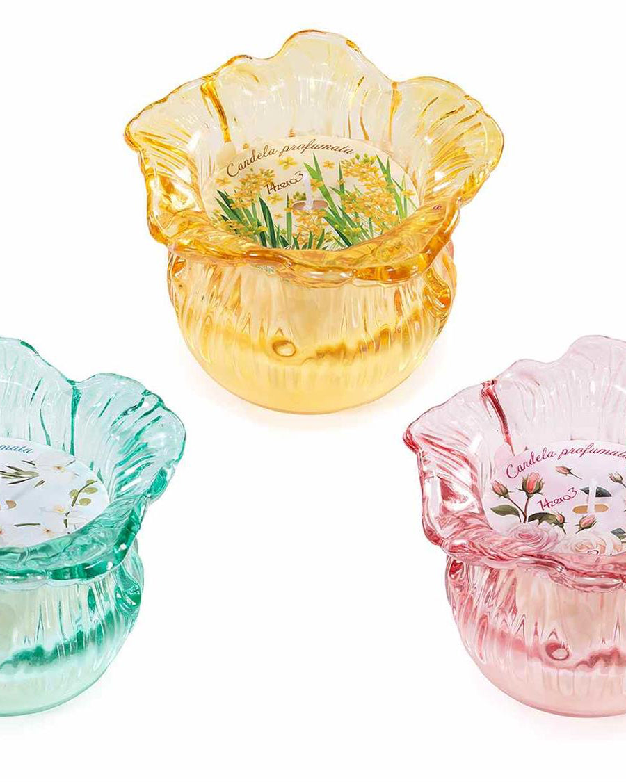 Skjønt gult duftlys i glass skål formet som en blomst i vakker gul pastellfarge. Duftlyset har en duft av forfriskende sitrongress og varer ca. 20 timer.