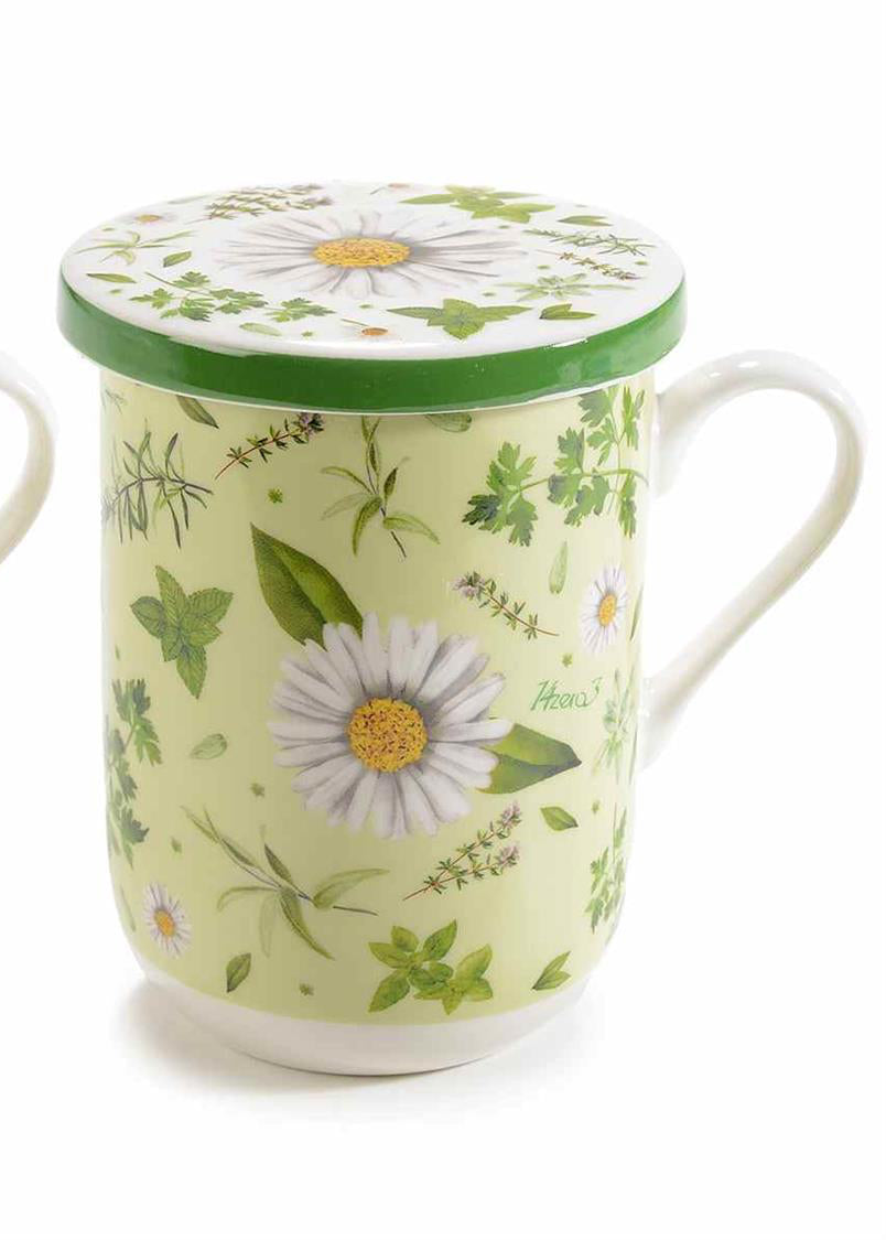 Sjarmerende krus med lokk i porselen på 300 ml fra Italia. Kruset har herlig dekor av prestekrager i grønt. Pris per stk.
