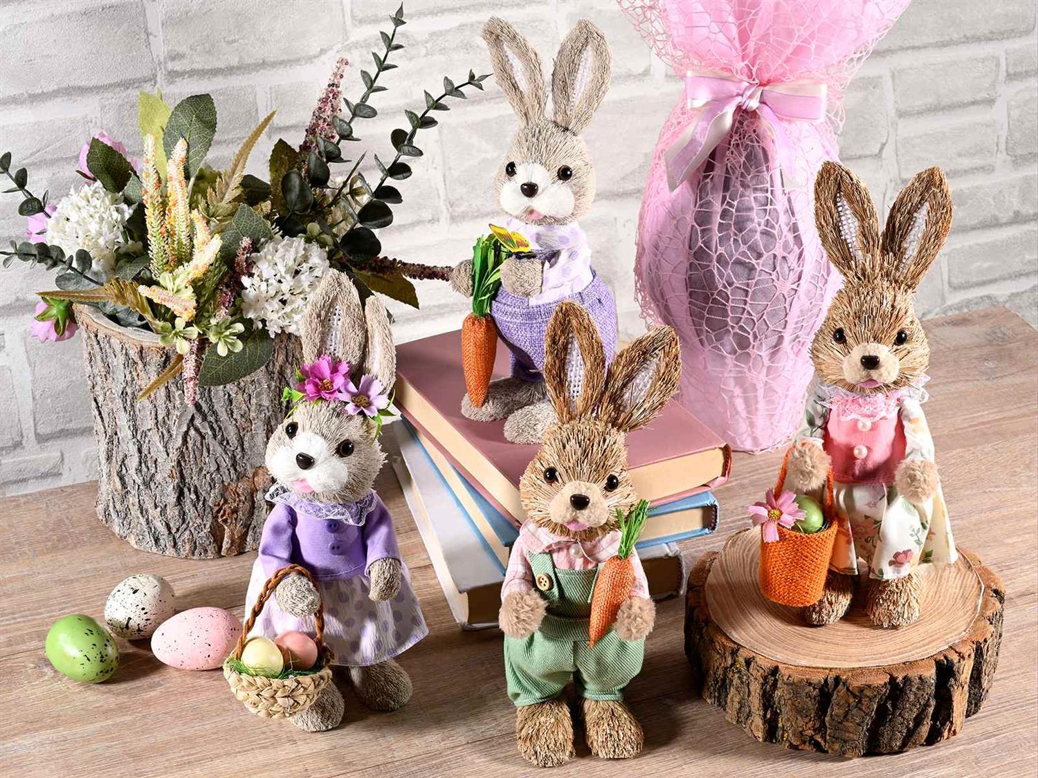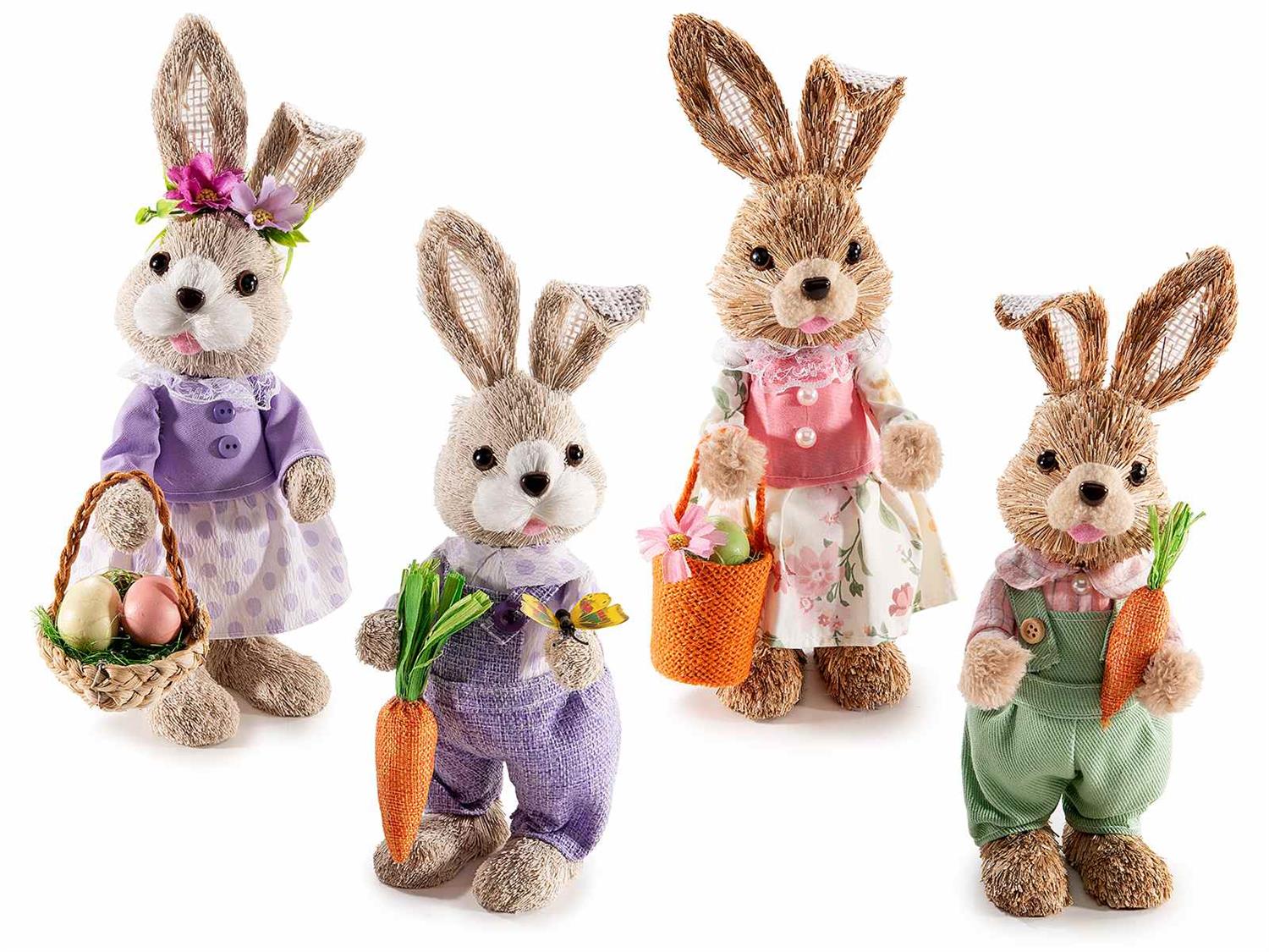 Den sjarmerende påskekaninen i lilla med gulrot kommer fra Art From Italy og er hele 27 cm høy med formbare ører. Den har herlige fargerike klær og er i fiber. Det er mannen med gulrot i lilla til venstre i bildet.